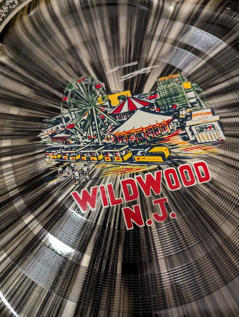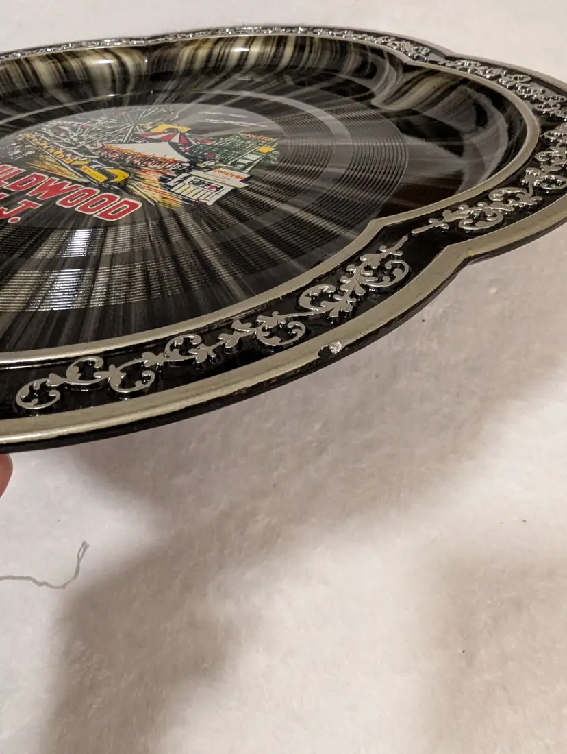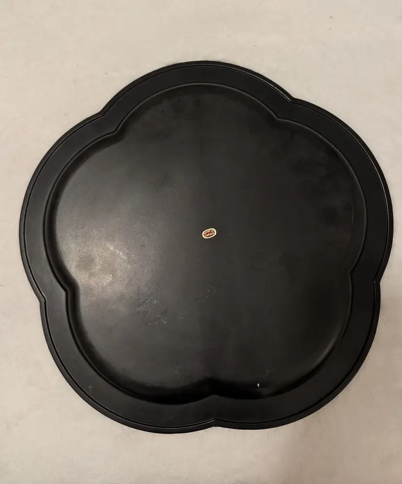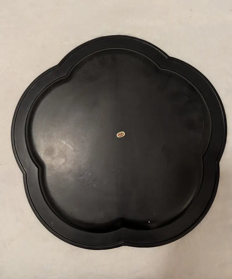 This MCM Japan Wildwood, NJ Atomic Starburst Serving Tray is a vintage piece that exudes a retro charm. Made of plastic with a glossy black finish, this 13 1/2" round tray features a unique Atomic Starburst pattern and petal scalloped edges. It is in really good condition except for a tiny chip on the edge (see photo). Perfect for all occasions, this medium-sized tray adds a touch of nostalgia to any kitchen or dining table. Hand wash only to maintain its original vintage look and ensure look and longevity.