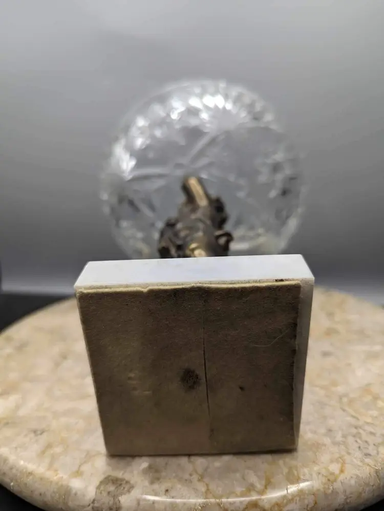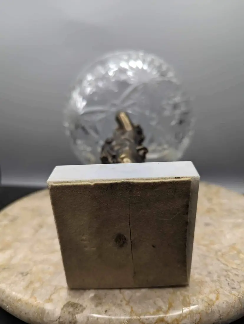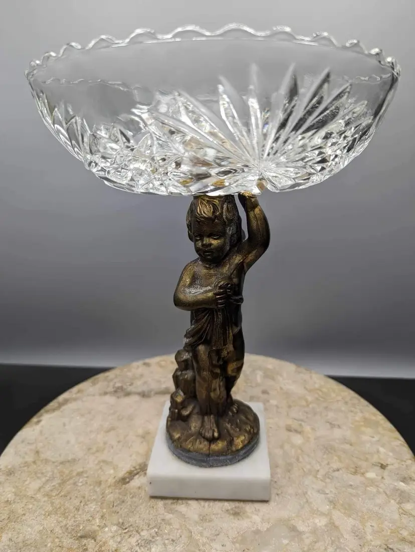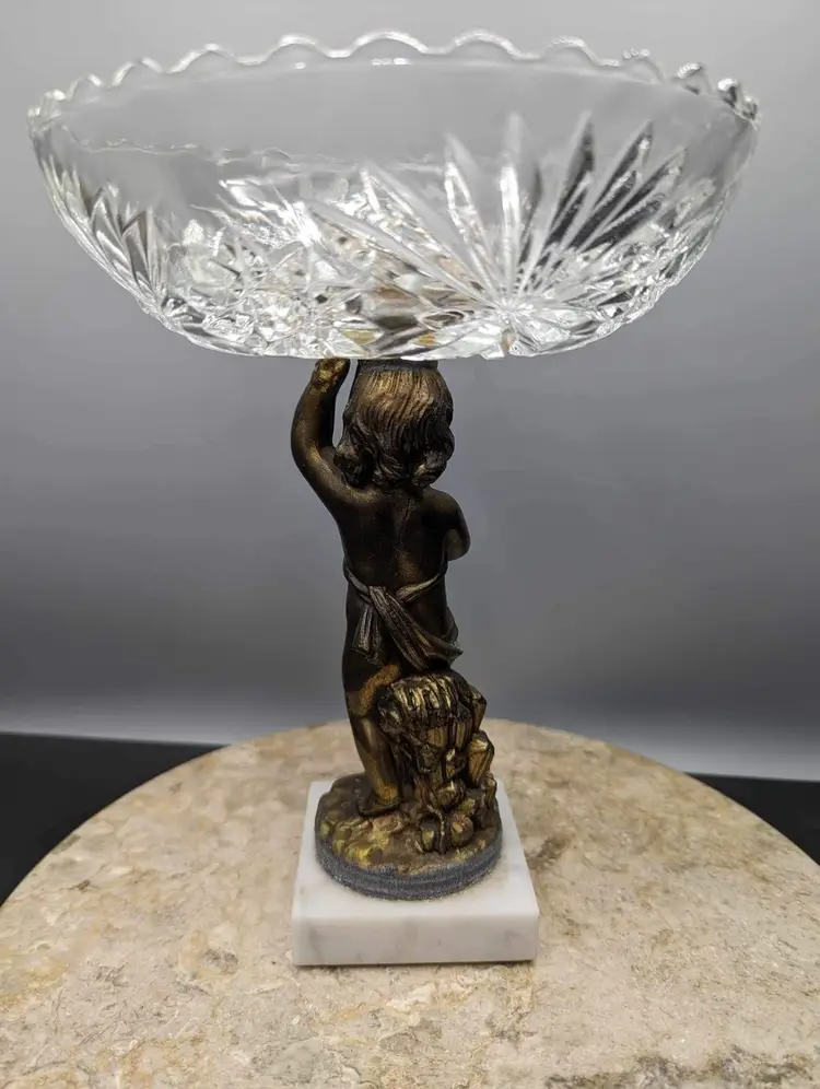 This exquisite lead crystal bowl atop a brass cherub that stands on a marble base from Italy is a true masterpiece that will bring a touch of luxury to any space. The intricate brass cherub figurine adds a charming accent to the piece, making it not only a functional item but also a decorative one. The clear crystal material allows for a beautiful display of light, enchanting anyone who gazes upon it. The mid-century modern style of this original piece is sure to attract collectors and enthusiasts alike. Perfect for display or practical use, this bowl is a must-have for any lover of unique and magnificent decor.