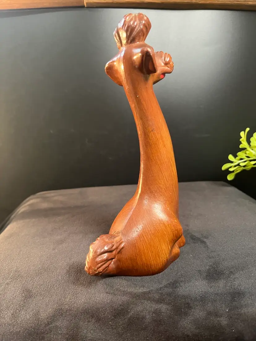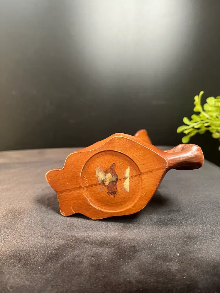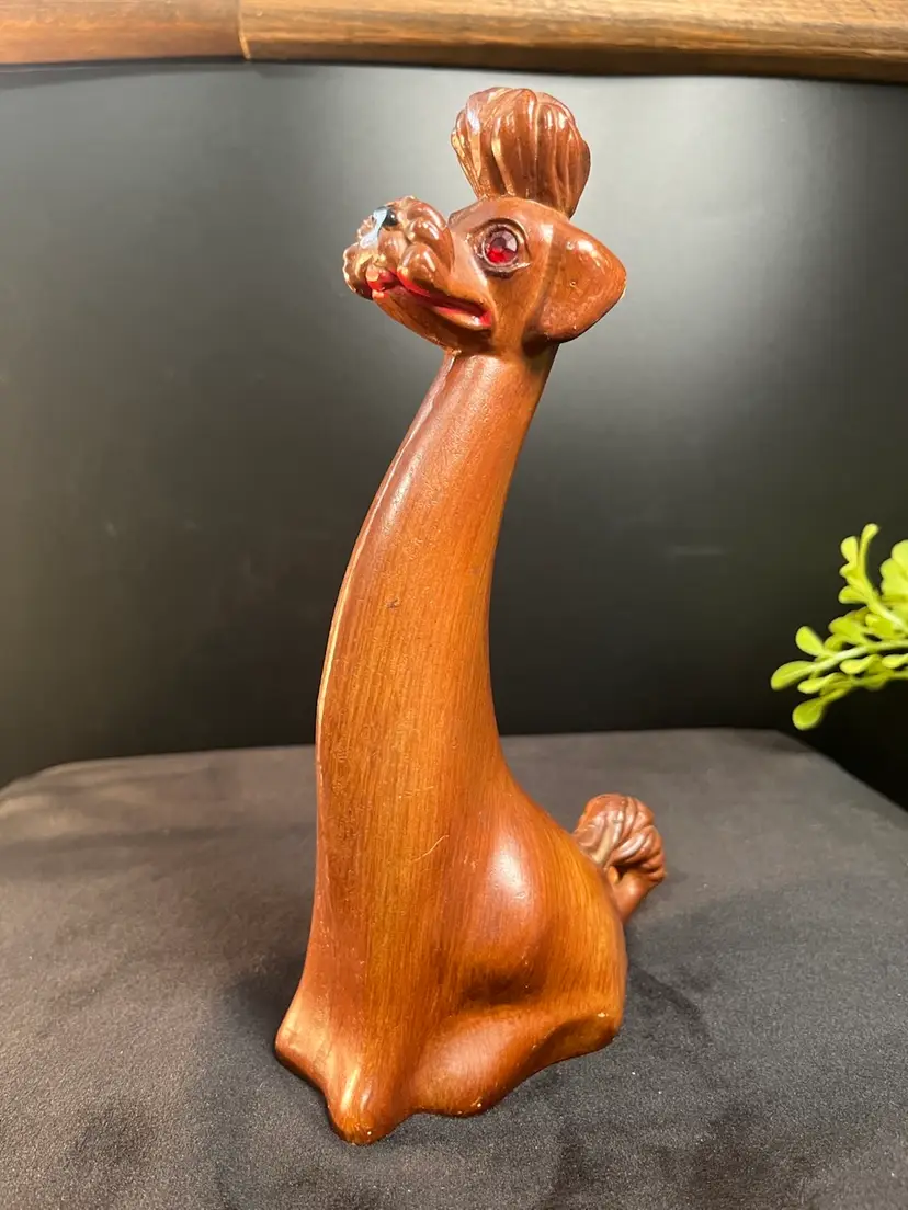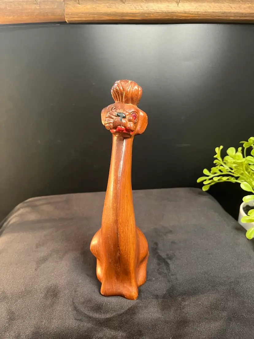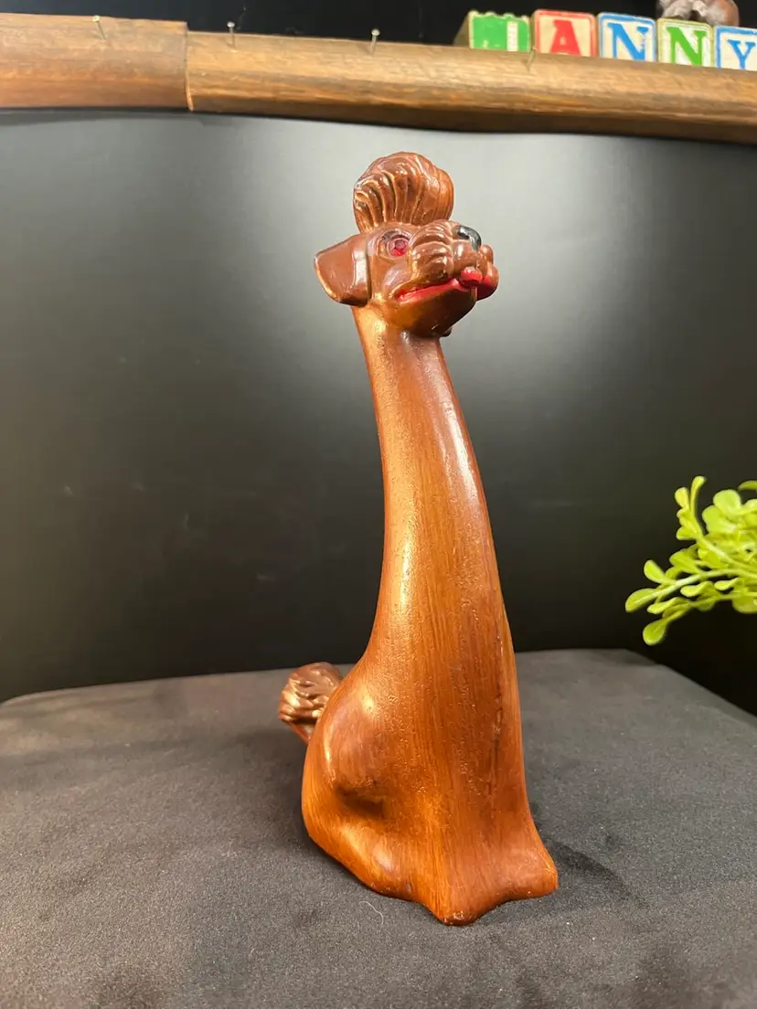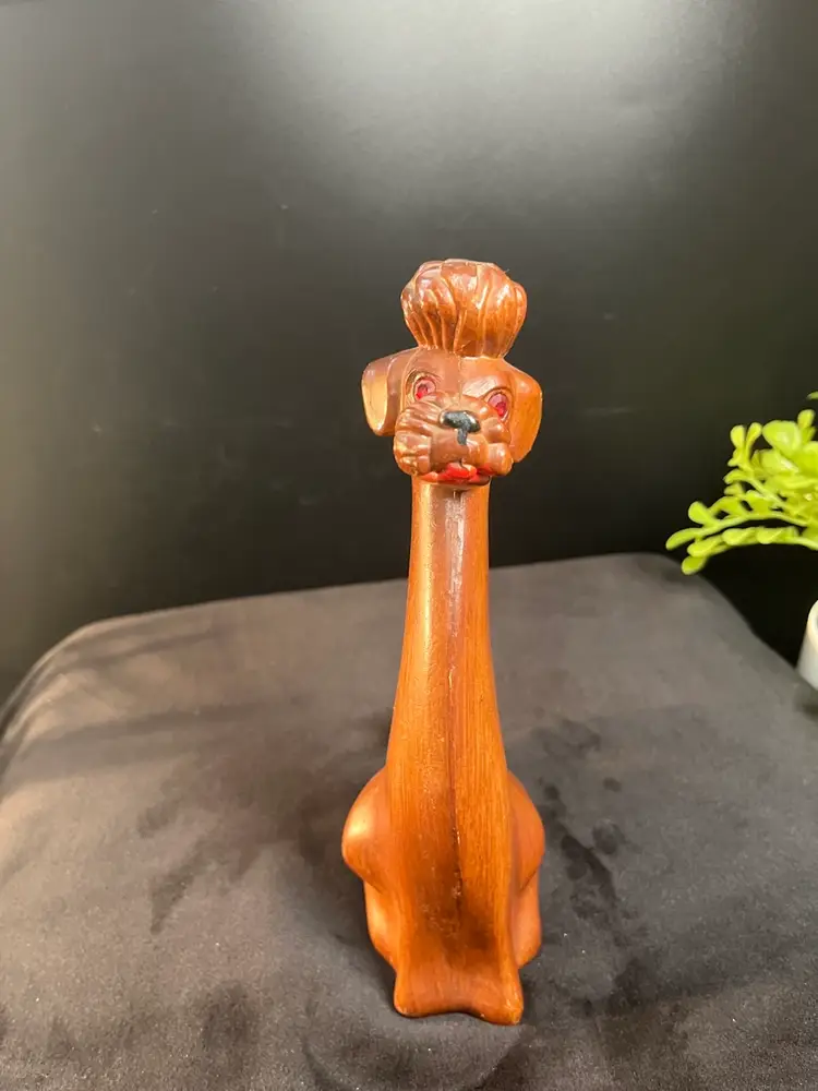 This is just cute & kitsch. I believe it is made out of faux wood and is in excellent vintage condition. His nose is painted a snappy black and mouth & tongue is painted red. It measures approx 8"H, 4.5"W, 2.5"Deep, 5 Oz