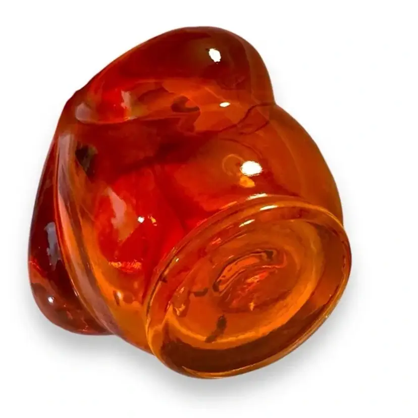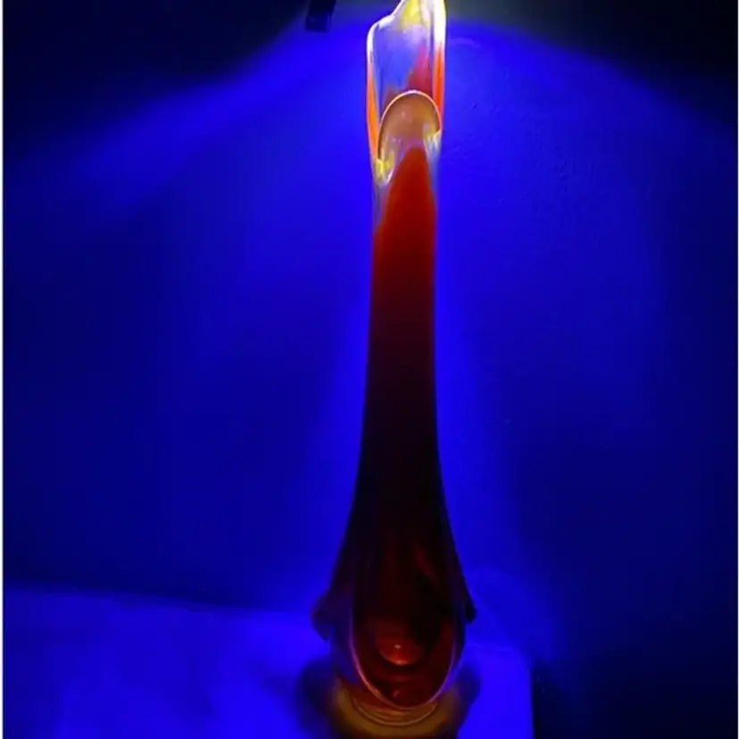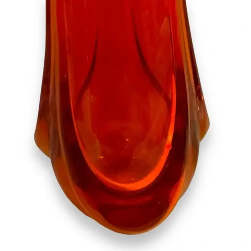 This amazing vintage swung vase is in excellent condition. There are no chips or cracks. It is persimmon with a yellow flame top that glows under black light. It is approximately 13 1/2” tall, but I rounded up to 14” for the listing.