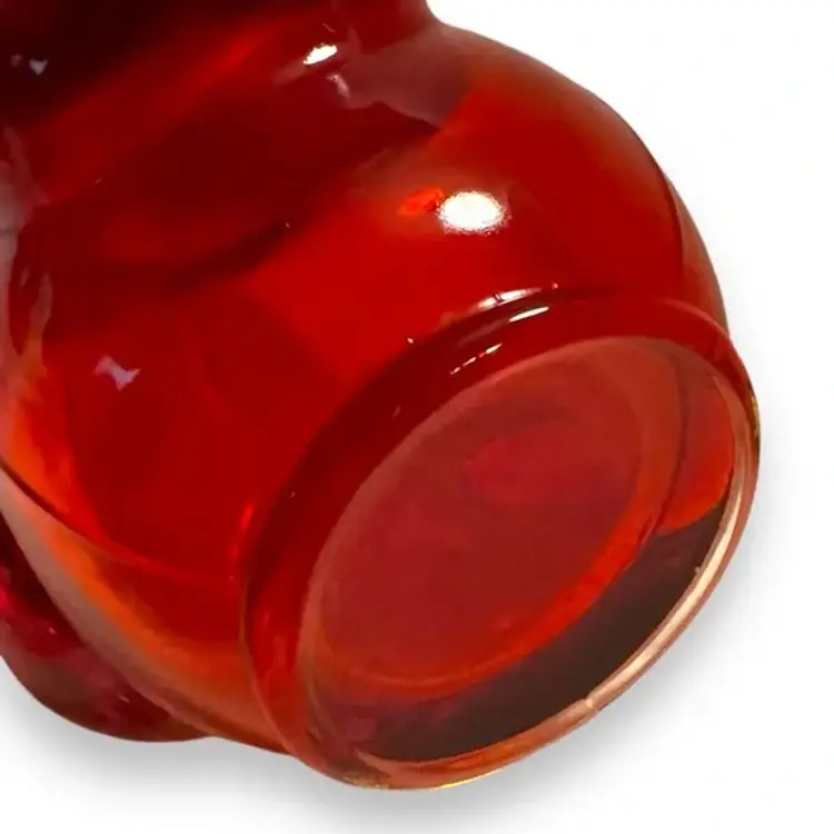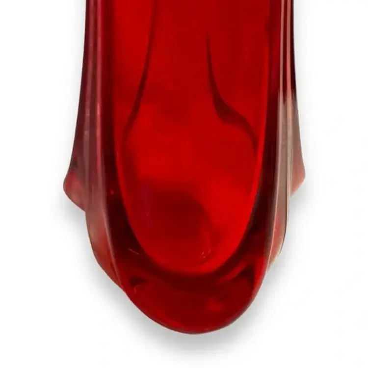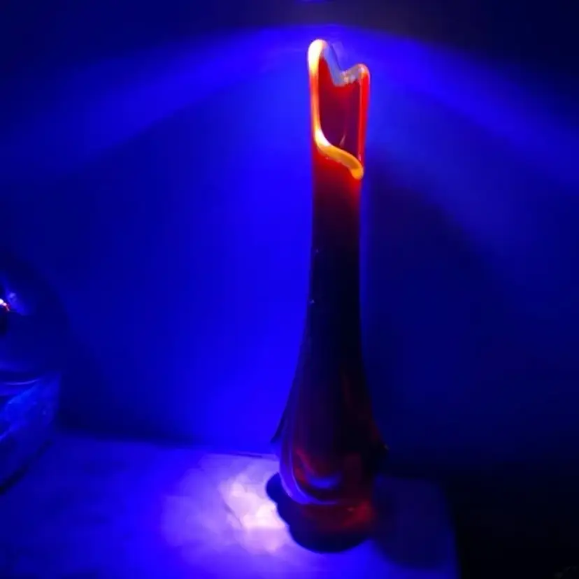 This amazing vintage swung vase is in excellent condition. There are no chips or cracks. It is red with a yellow flame top that glows under black light. It is approximately 13 1/2” tall, but I rounded up to 14” for the listing.