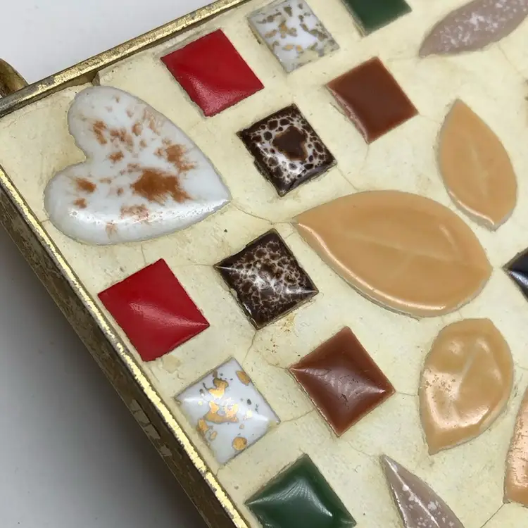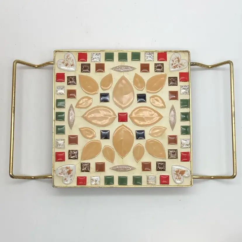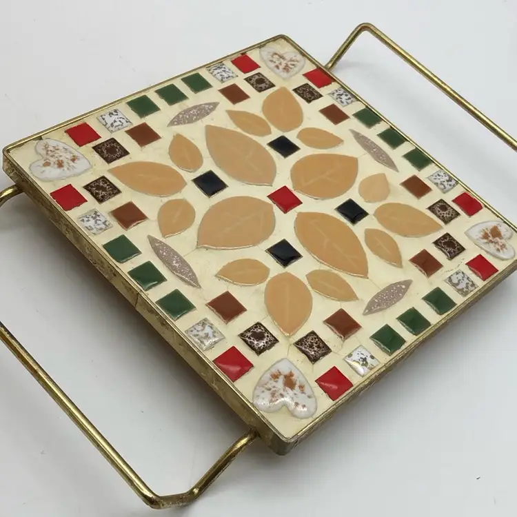 So retro cool for your kitchen or bar! Shows vintage wear with PATINA on the metal and cracking of the grout, as pictured. 6.5” square trivet has 10" measurement including handles. Dig it.