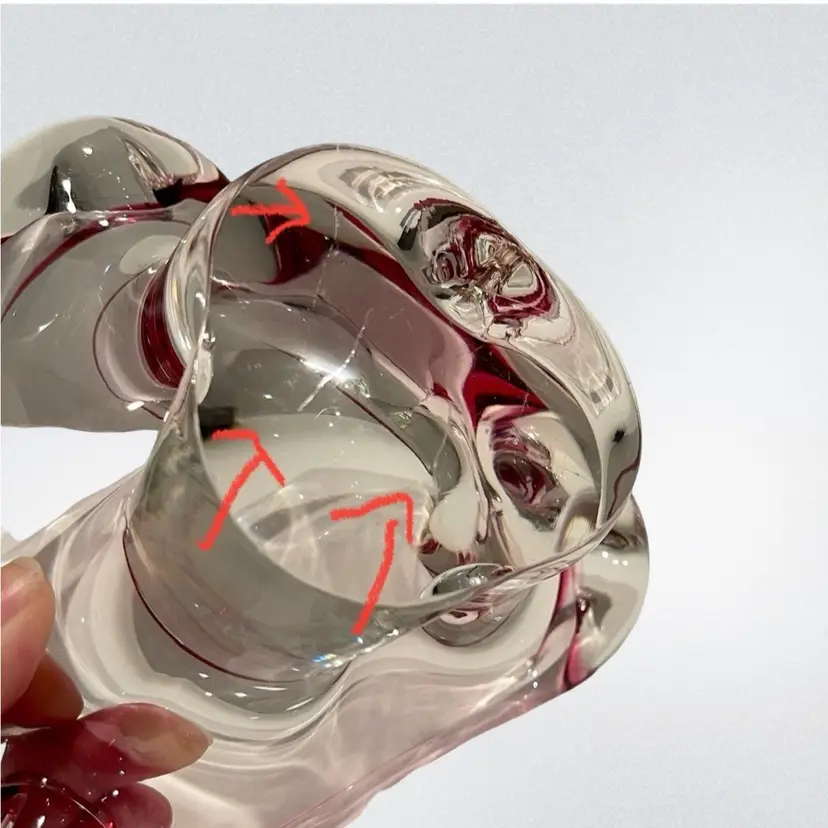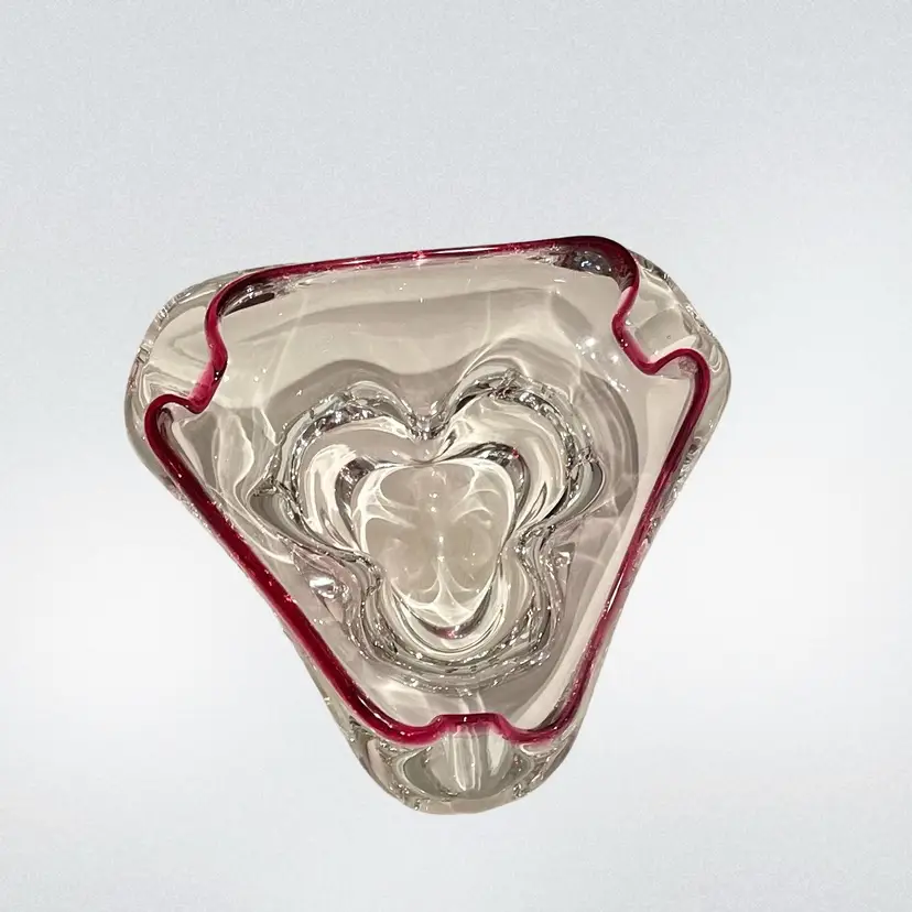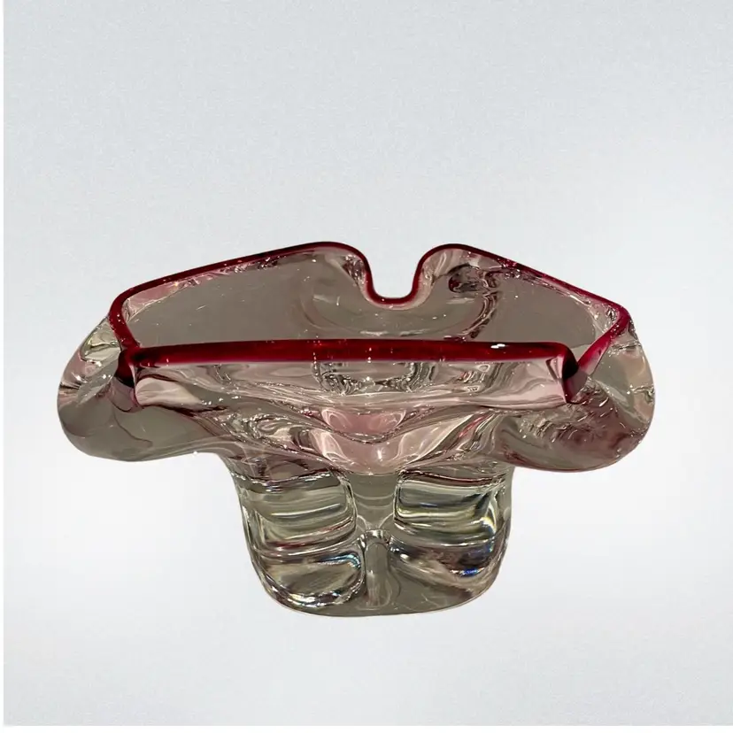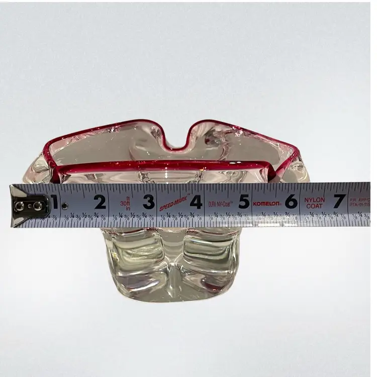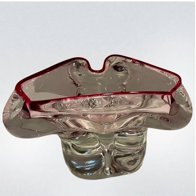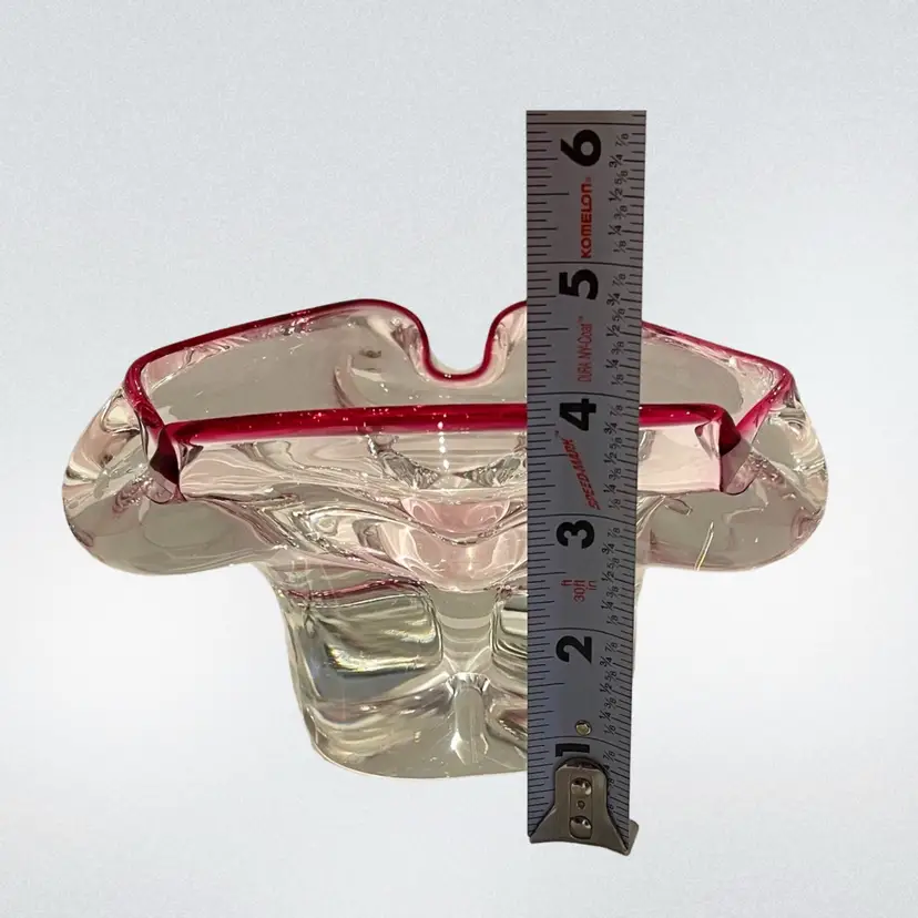 Three sided clear glass with pink edge (heavy). Condition: Scratches on the bottom. Measurements: Approximately 4” T x 6” W. Please see pictures for condition and measurements. N2-1821 Thank you for looking!