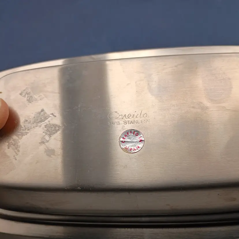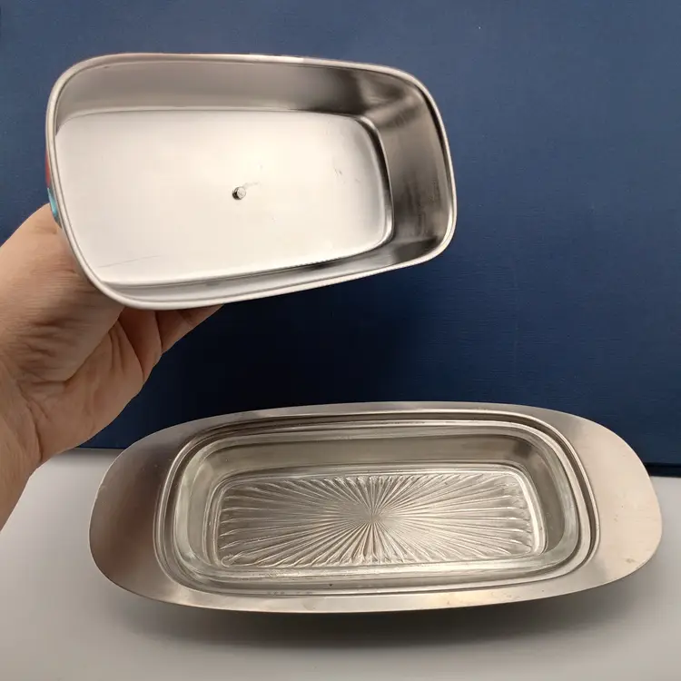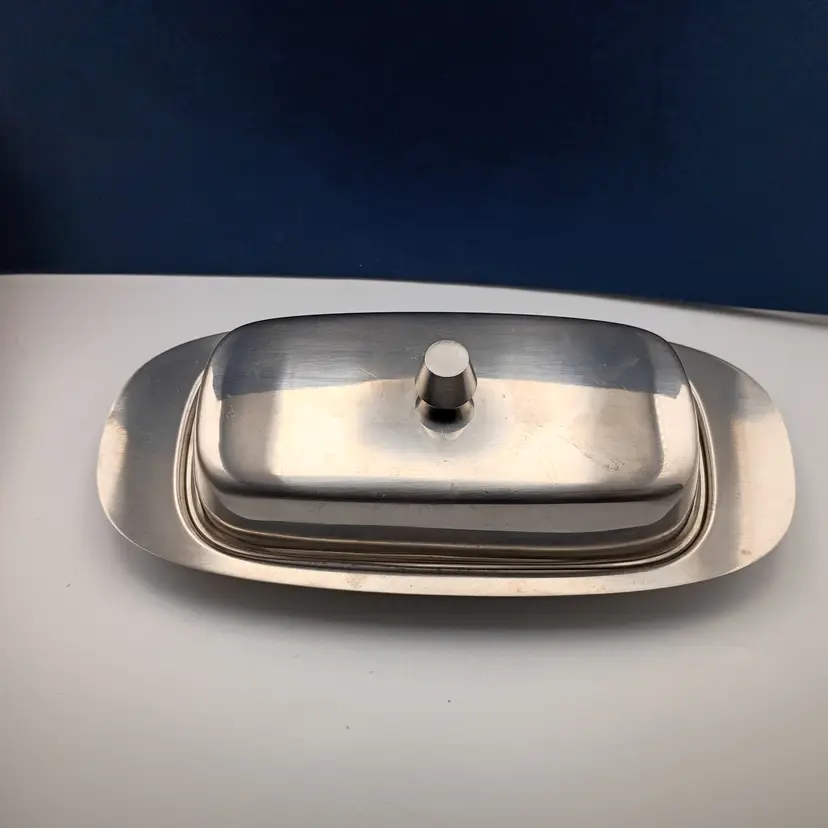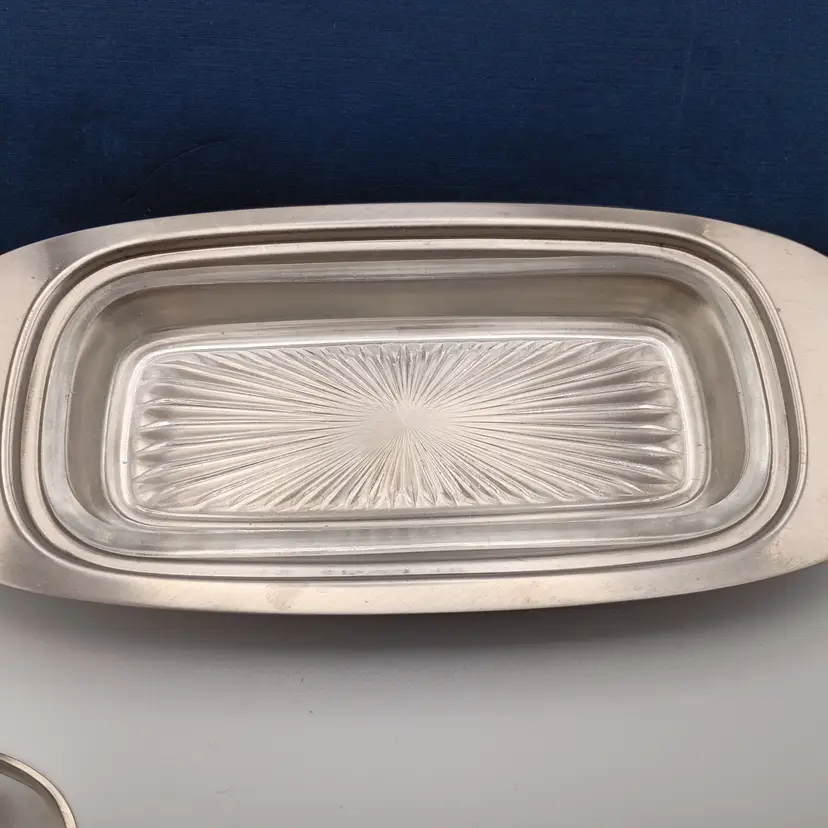 It's a fabulous midcentury modern butter dish in stainless steel with a glass insert by Oneida and made in Japan. It's in excellent vintage condition with no chips or cracks and an original sticker.