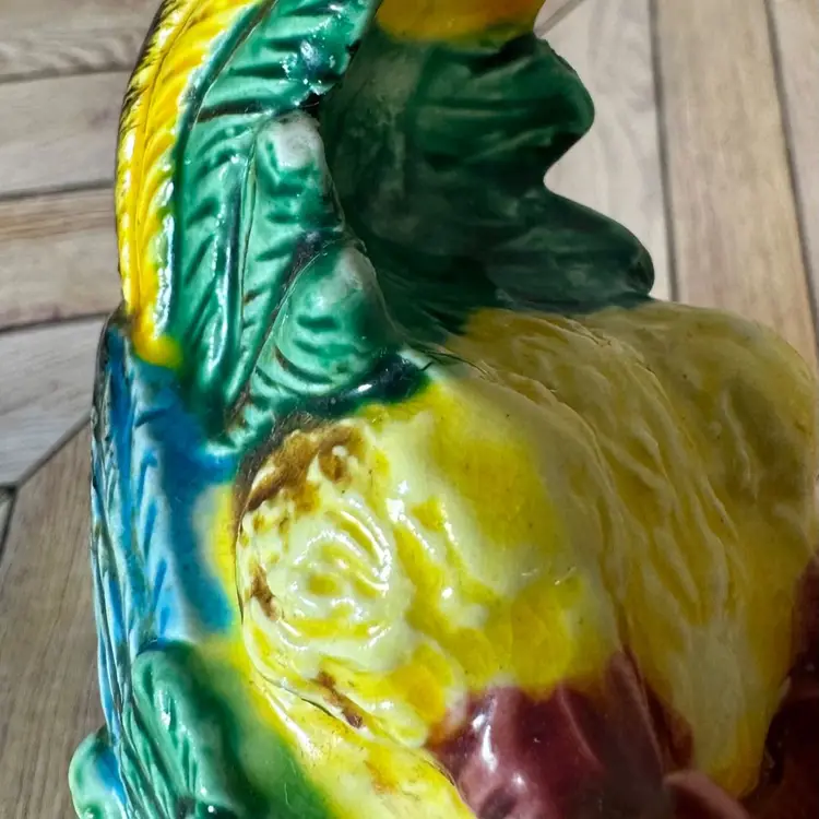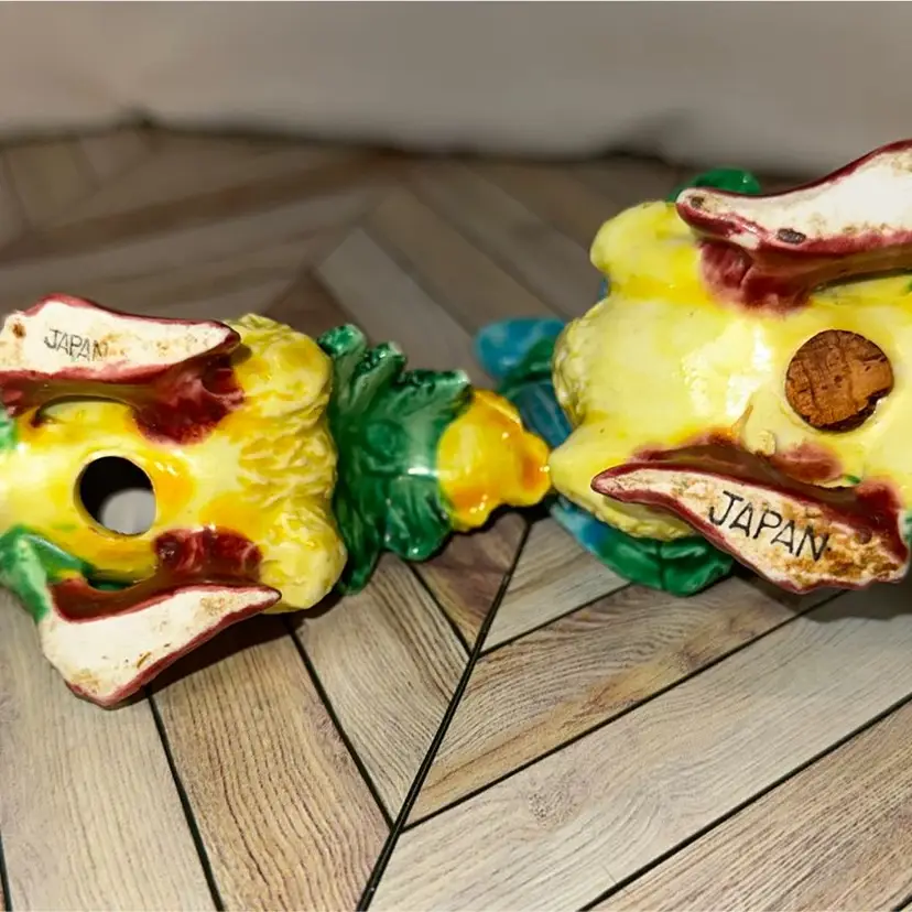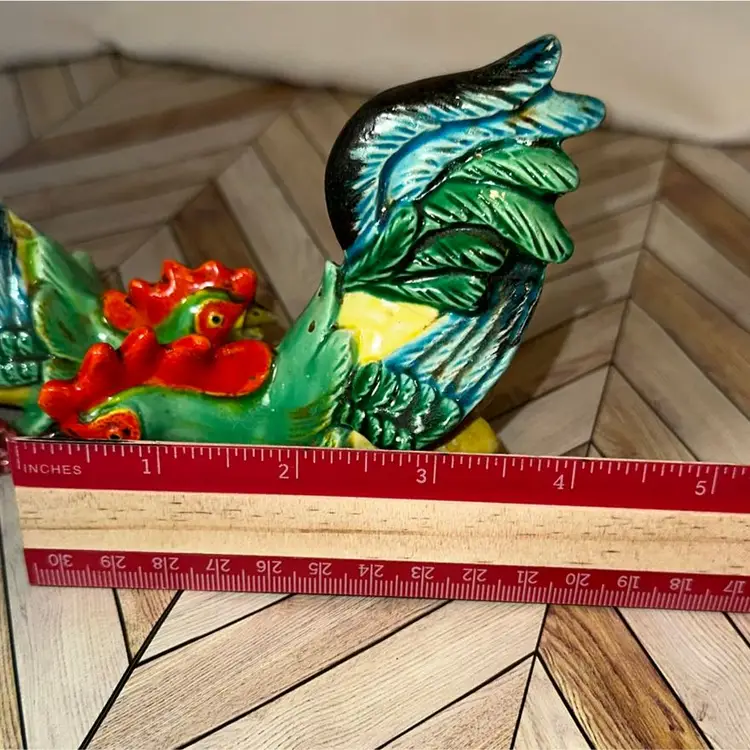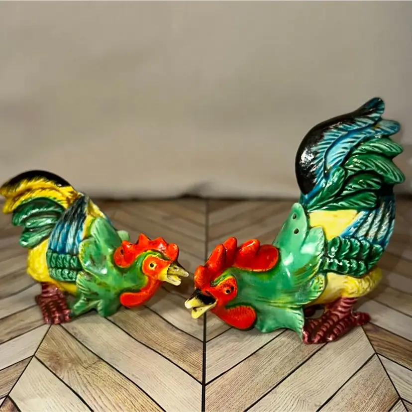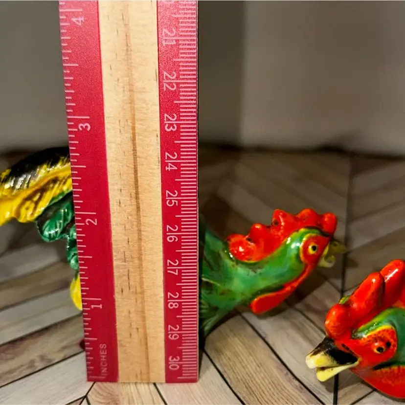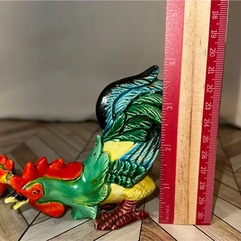 The taller of the two in this set stands just short of 4” and measures 4 1/4” from beak to end. Both salt and pepper shakers are stamped Japan. One has its cork stopper, and the other is pushed inside. There is small paint loss on the tail feathers of the shorter chicken.