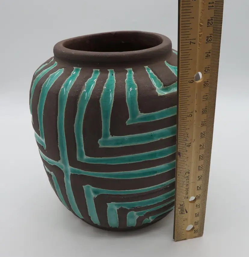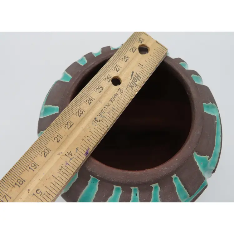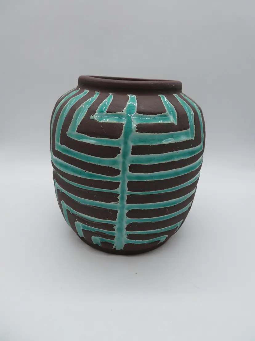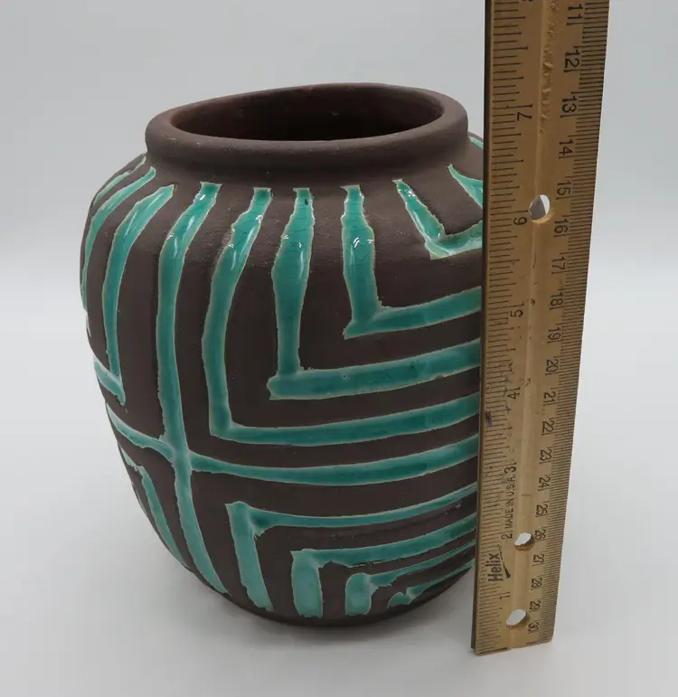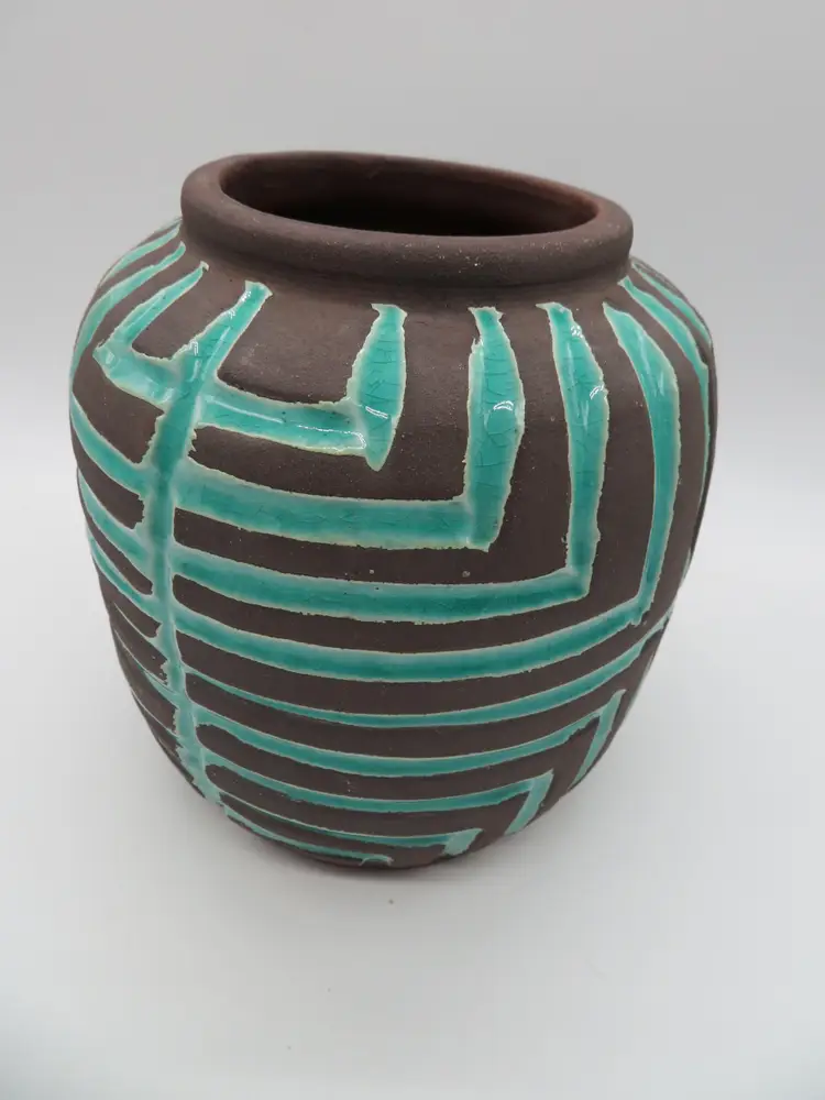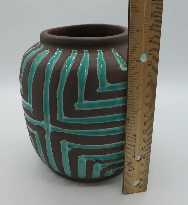 For your consideration is a MCM raku pottery vase, done with a turquoise overlay and a brown/black burn. This vase stands 6.5” tall, has a 6” dia body and a base that is 4.75”. It weighs 3.2 pounds, so shipping with be 4 to 5 pounds. A great addition to any décor. I ship daily, wrap all items for a safe trip through the mail system. Thank you for viewing my store, happy shopping!