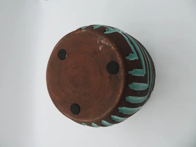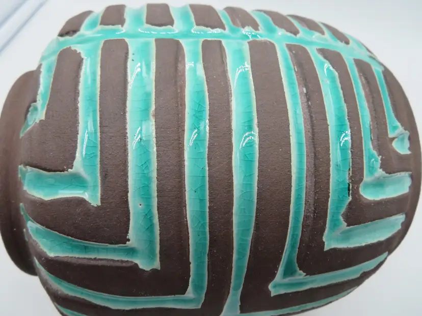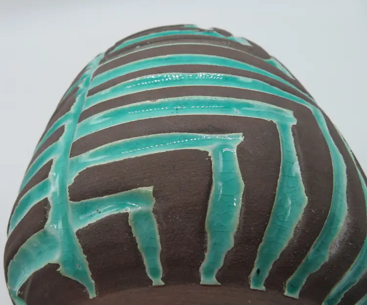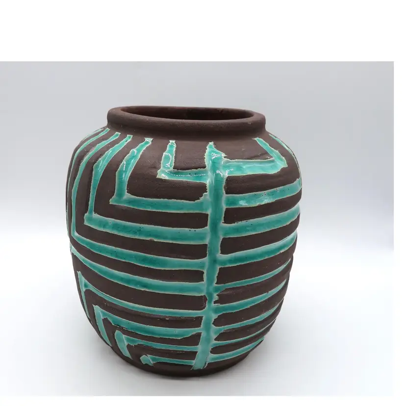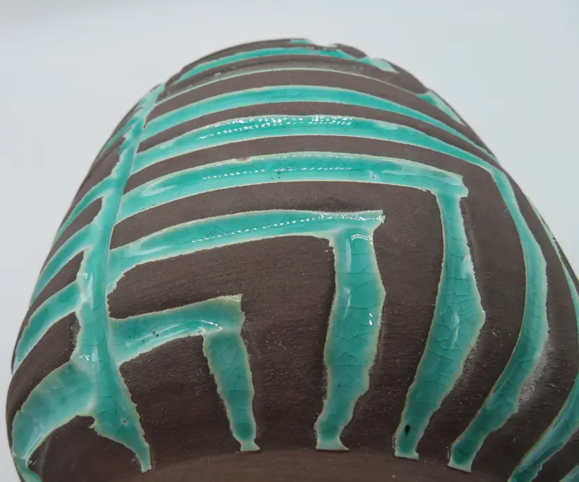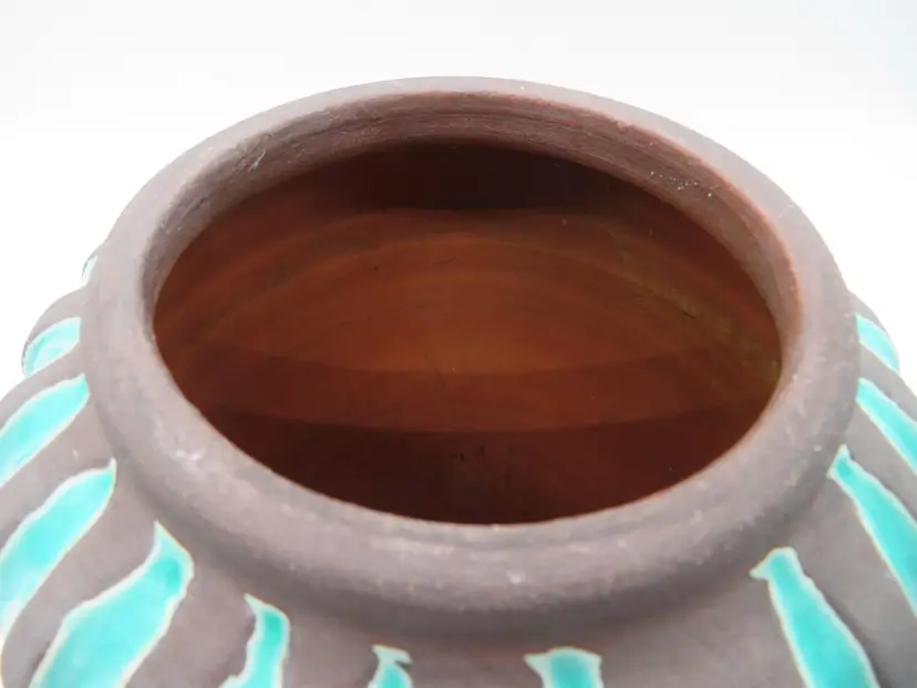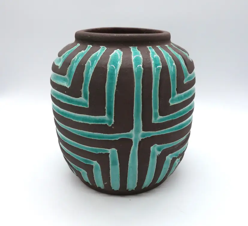 For your consideration is a MCM raku pottery vase, done with a turquoise overlay and a brown/black burn. This vase stands 6.5” tall, has a 6” dia body and a base that is 4.75”. It weighs 3.2 pounds, so shipping with be 4 to 5 pounds. A great addition to any décor. I ship daily, wrap all items for a safe trip through the mail system. Thank you for viewing my store, happy shopping!