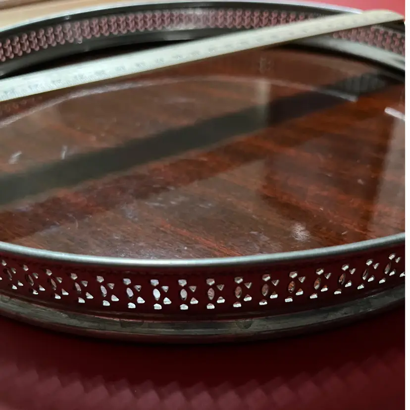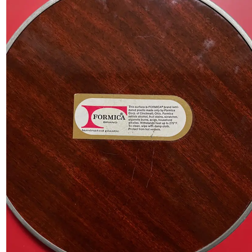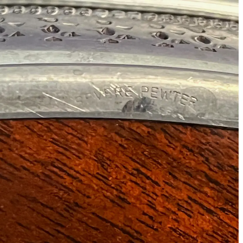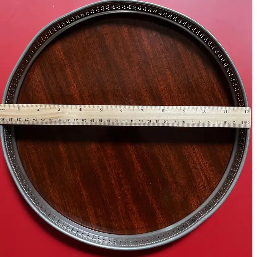 This amazing piece of mid-century modern barware would be perfect to serve Don Draper an Old-Fashion on. It is 12 inches in diameter and made by Revere Pewter. There are some scuffs and dents, but they do not distract from the timeless chic of this piece. Made by Revere Pewter, it measures 12 inches in diameter with a reticulated pewter rim. It also features fabulous Faux Brown Wood made by Formica. The tray is perfect for serving cocktails and other beverages, and its vintage design makes it a great addition to any barware collection. The tray is an original piece from the 1950s to 1960s and is made in the United States. It is made of pewter and Formica and features a Revere Pewter logo.