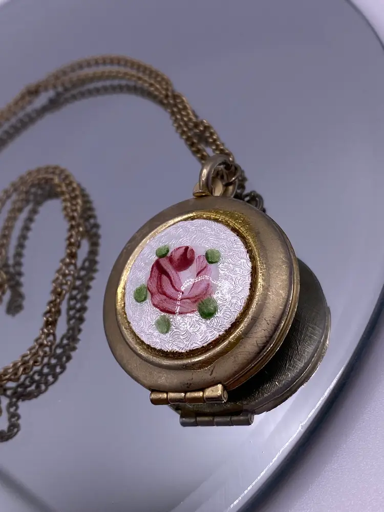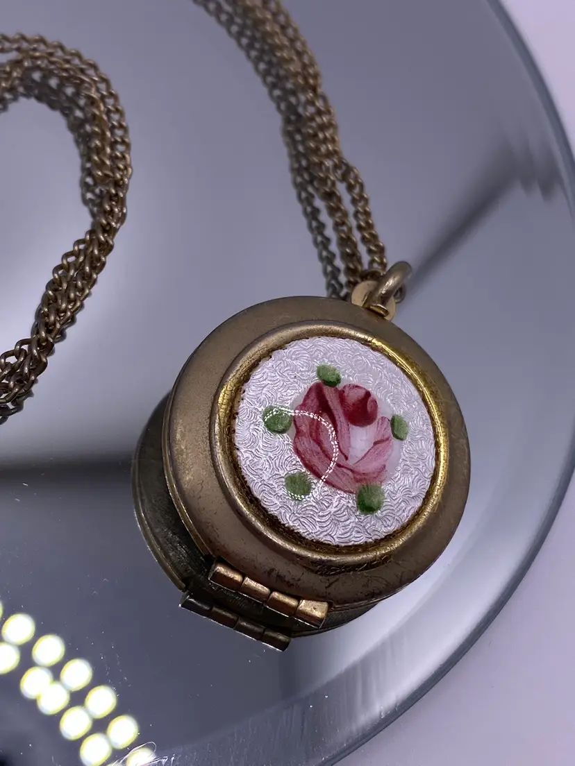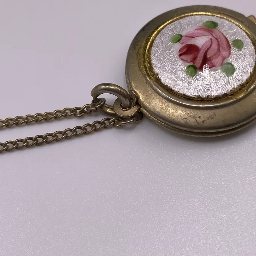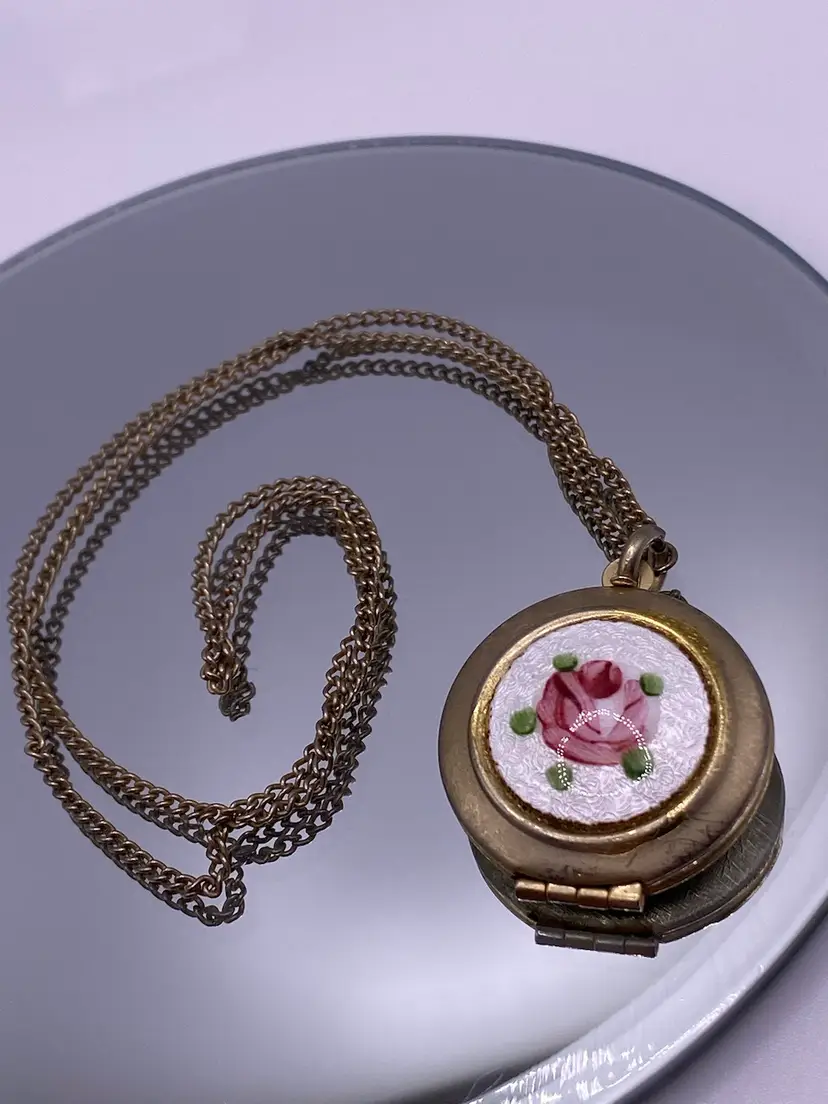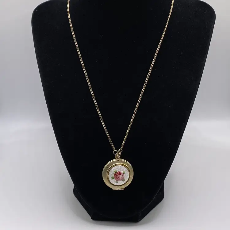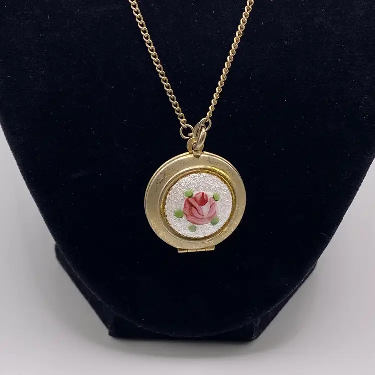 Add a touch of vintage charm to your everyday or casual outfit with this beautiful MCM necklace. The necklace features a round rose enamel guilloche pendant with a spring ring closure, measuring 18" in length with a 1" pendant. The silver tone metal necklace is perfect for any occasion and is sure to make a statement.