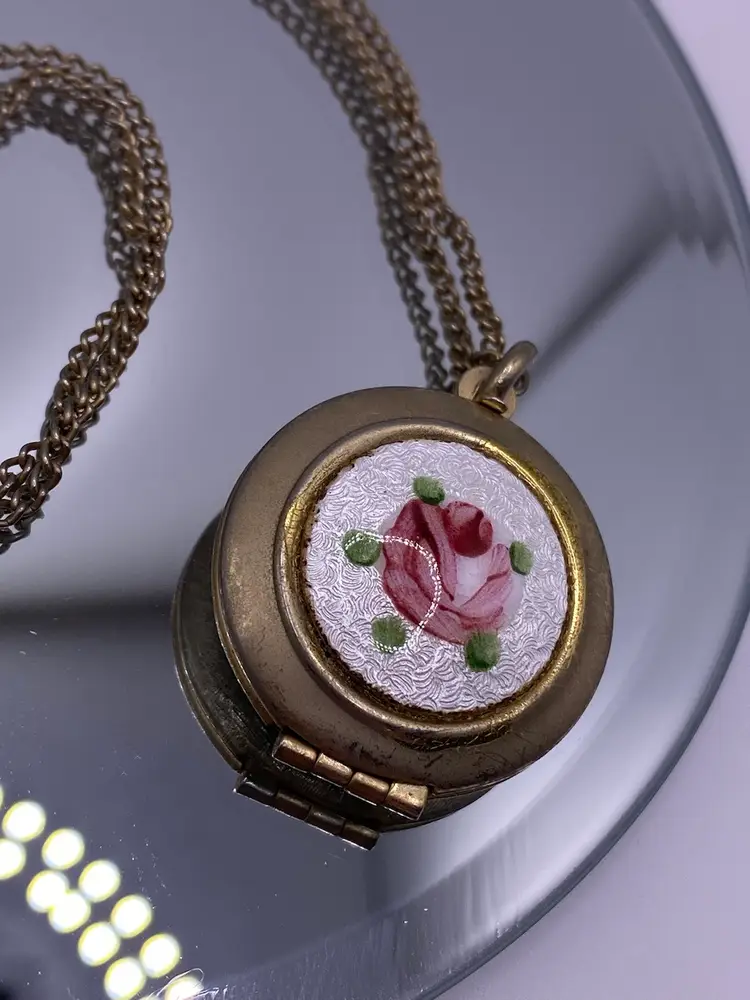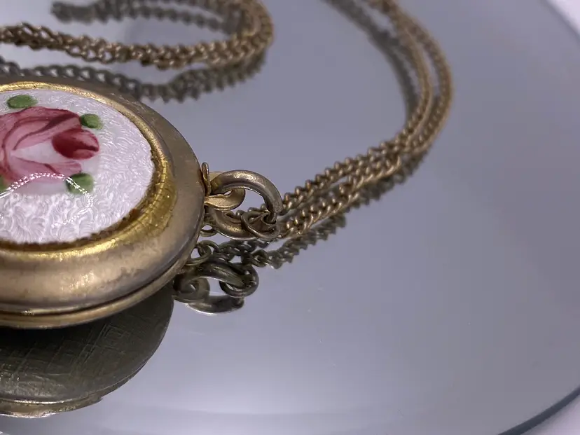 This necklace comes in good pre owned vintage condition. Some signs of wear to the enamel as well as the silver tone chain & metal.