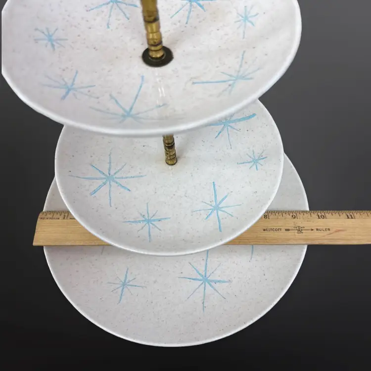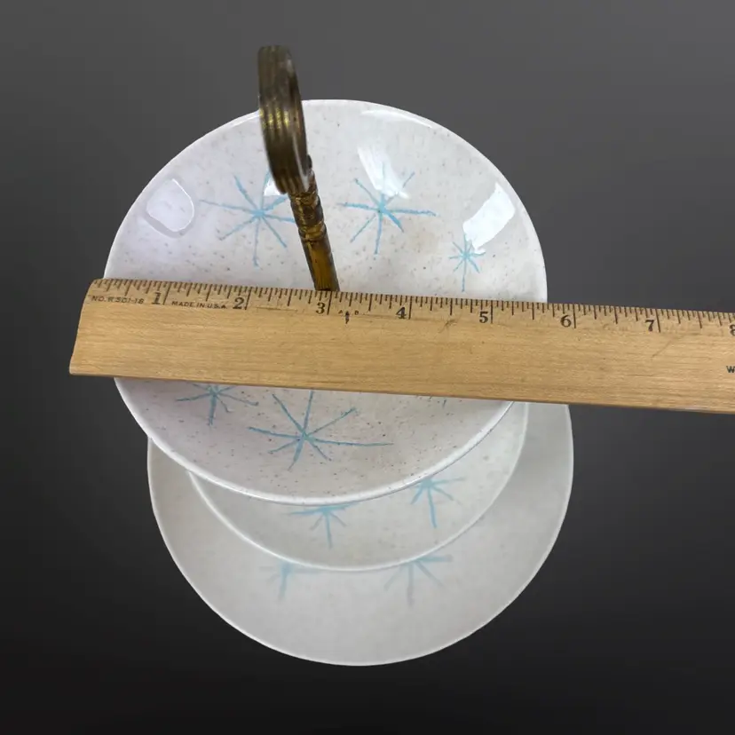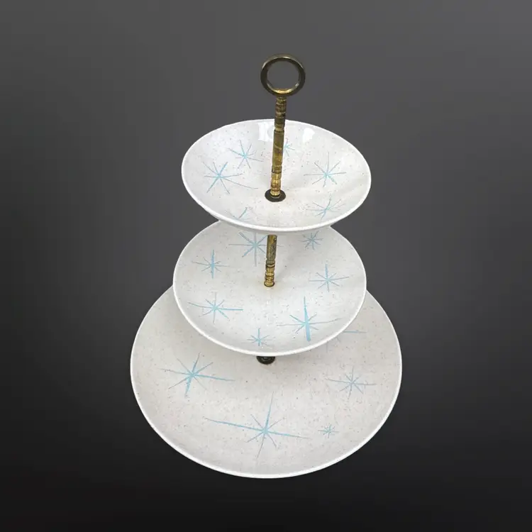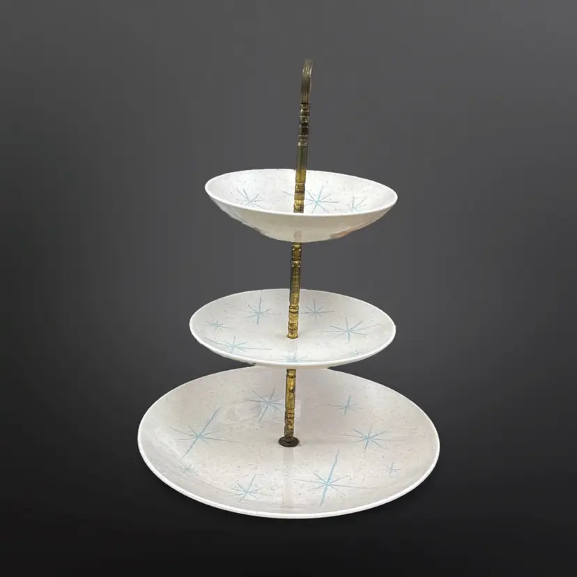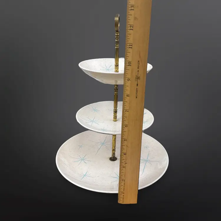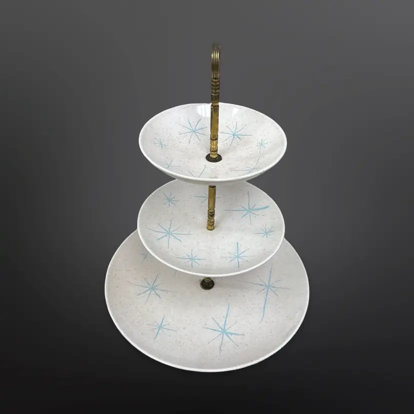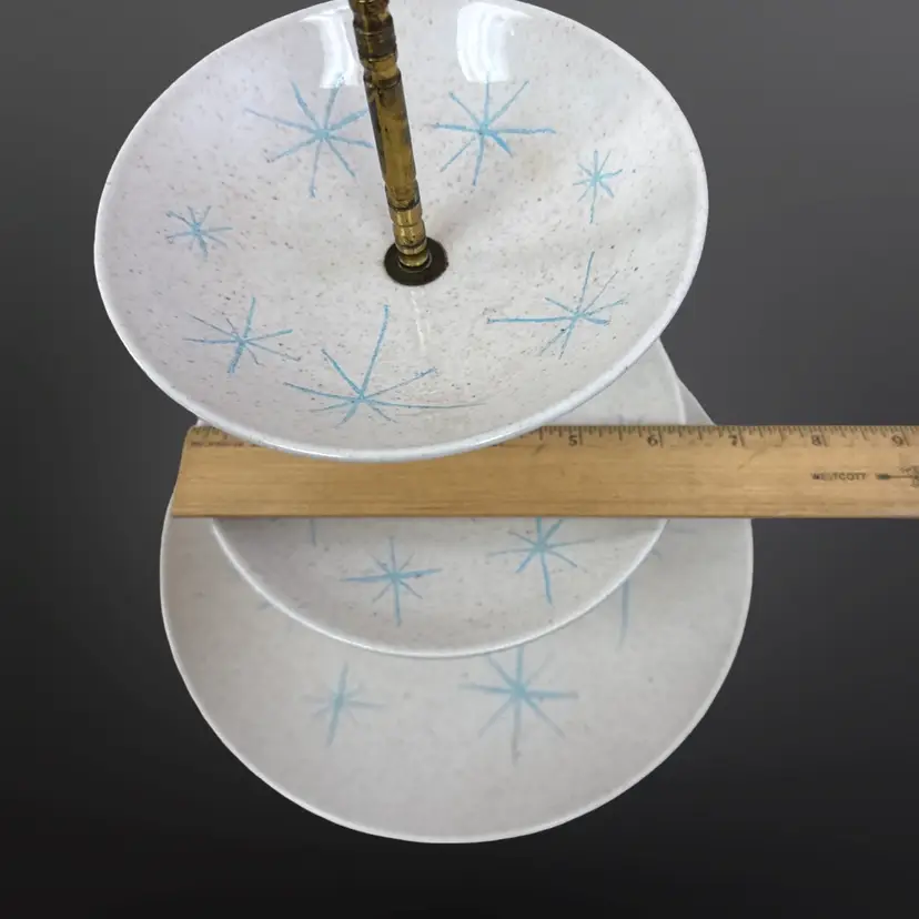 Great MCM 3 tiered serving tray with a turquoise atomic starburst design on off white speckle glazed trays, and gold tone handle. It is in very good vintage condition with no chips or cracks observed; some age related wear as seen in photos. Will be disassembled for safe shipping. Measures approximately 12.5” tall.
