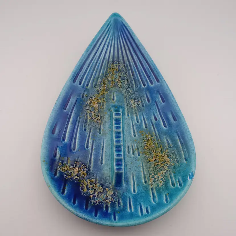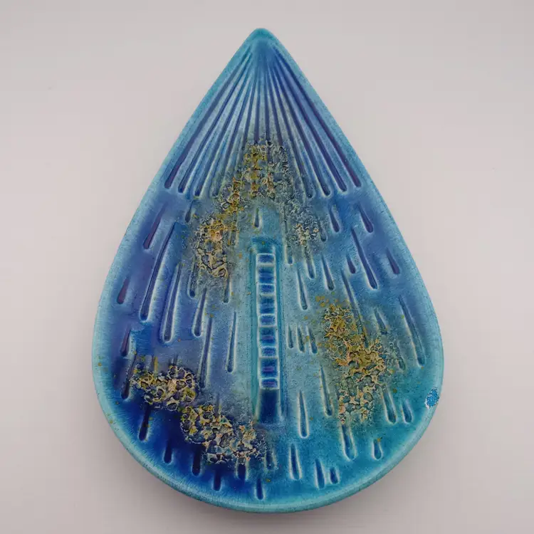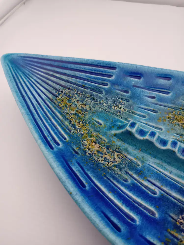 This is a special piece -- the Royal Haeger ashtray 173. With a classic midcentury shape and luscious turquoise, blue, and yellow textured glaze -- it will be the star of your coffee table. There is a chip on the edge that has been colored in with a blue paint/marker, as shown in the last picture. It's just over 10" long and 6.5" wide at the widest point.