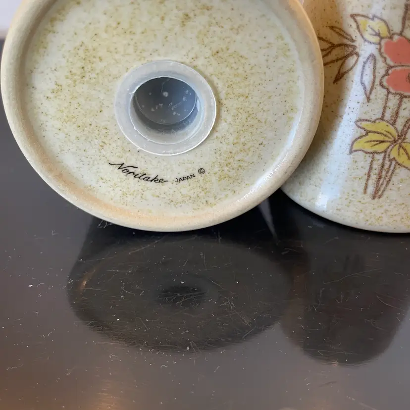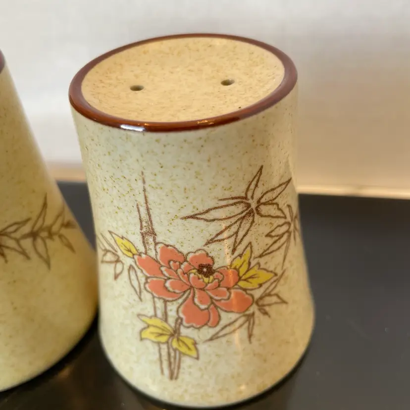 This set of Noritake Rapport series , Japan, salt and pepper shakers 3 inches tall both have plugs. Stoneware is speckled, great addition to the MCM Kitchen.