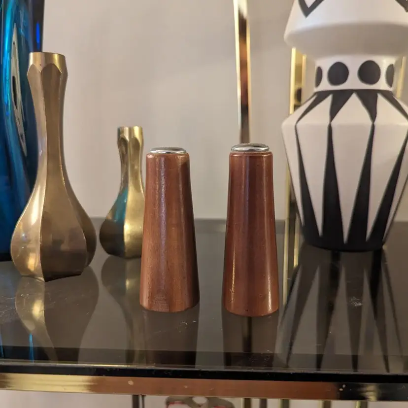 Made of wood - stamped Japan at the bottom and slight buffing on the edge of one - see pics. Approximately 4 inches tall. Lightweight shakers.