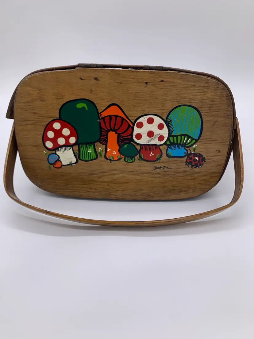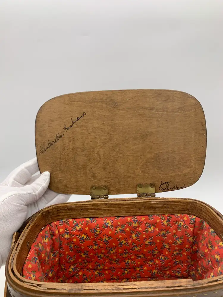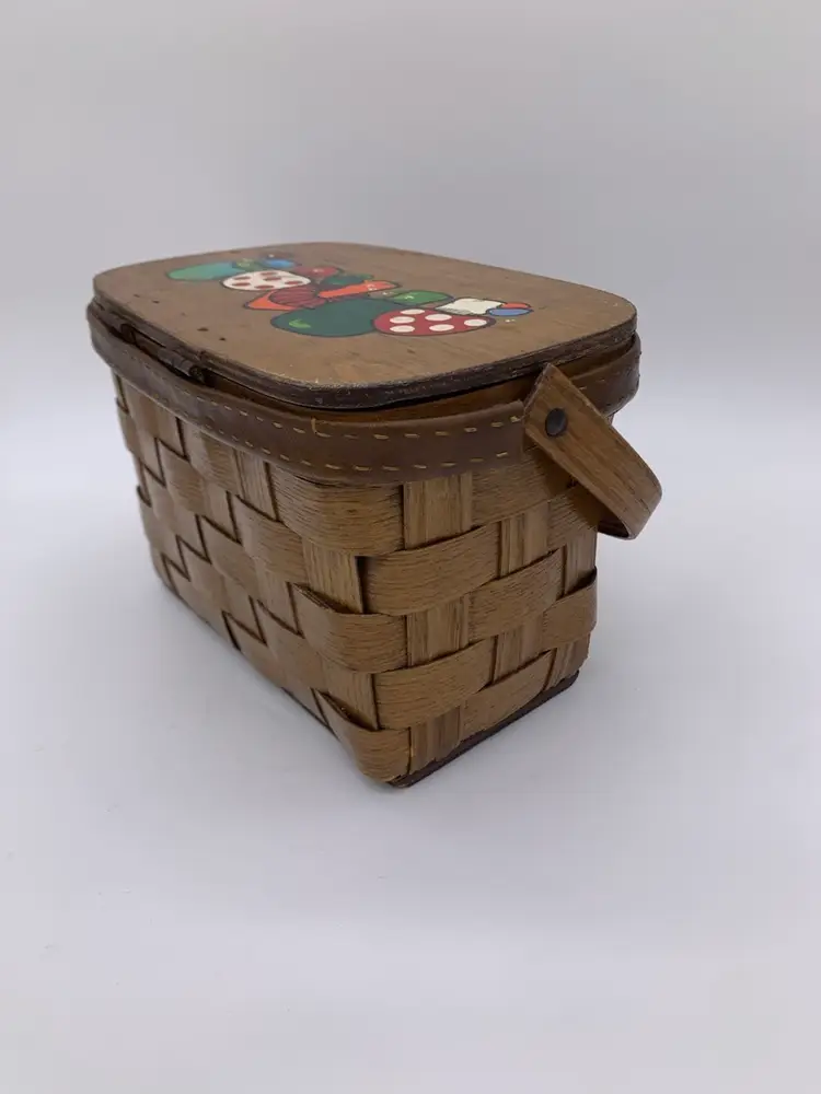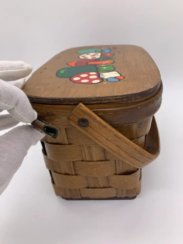 This beautiful MCM basket is a one-of-a-kind piece that will add a touch of vintage charm to any room. The woven painted mushrooms design, created by Caro Nan, is a perfect example of the artistic flair of the 1950s-1960s. The basket is made of wood with a fabric interior and features a wooden lid with metal hinges with a felt covered bottom. It is signed by the artist and handmade, making it a unique addition to any collection. The basket is a versatile fashion basket, purse,lunch basket, sewing basket, or as a decorative piece. It has a rectangle shape, measures 9" in length, 6" in height, and 5" in width, and weighs 1 Lbs & 3.7 Oz. This one of a kind adorable basket is in Excellent condition for its age see all pictures for details.