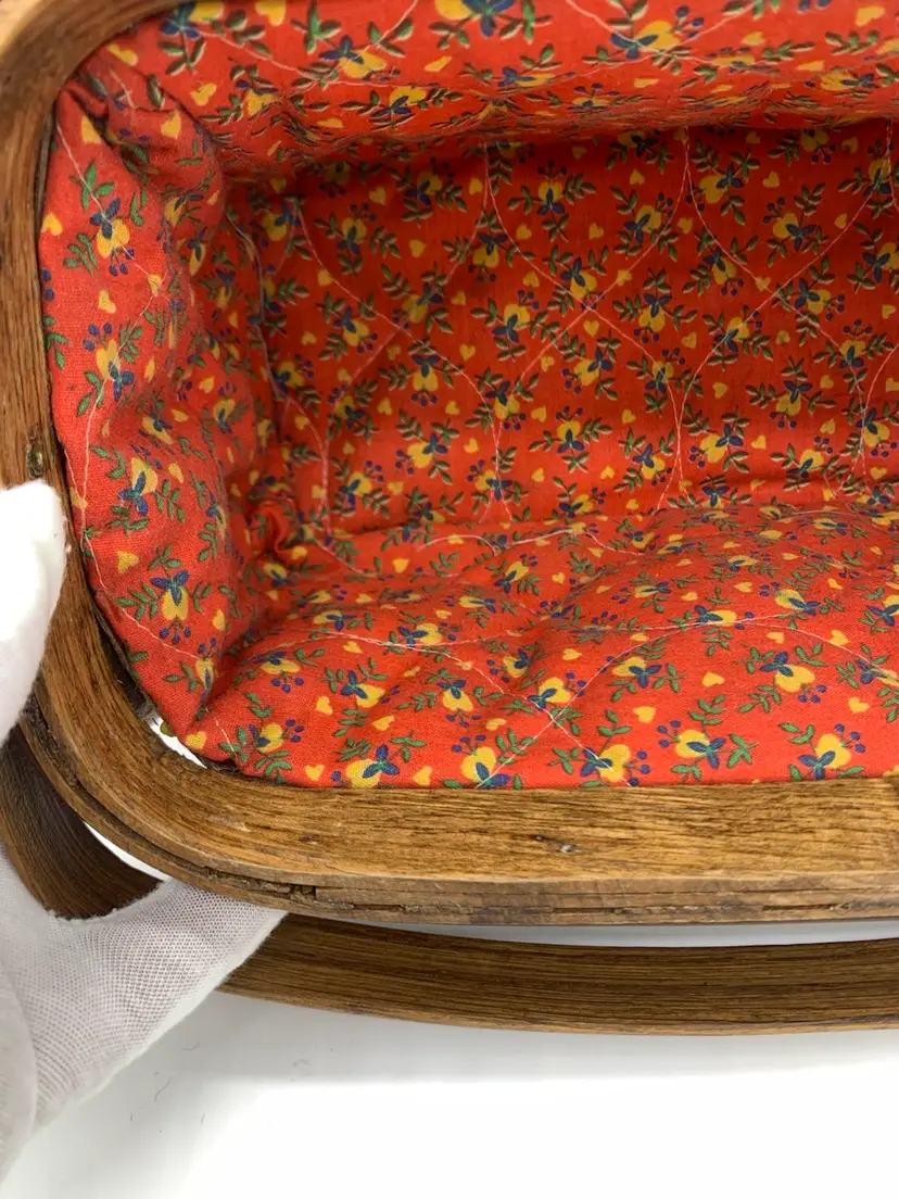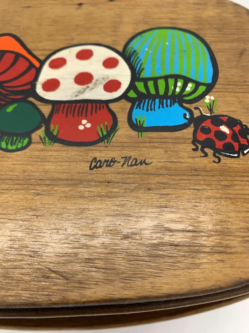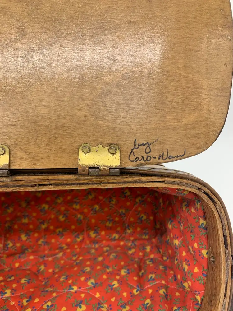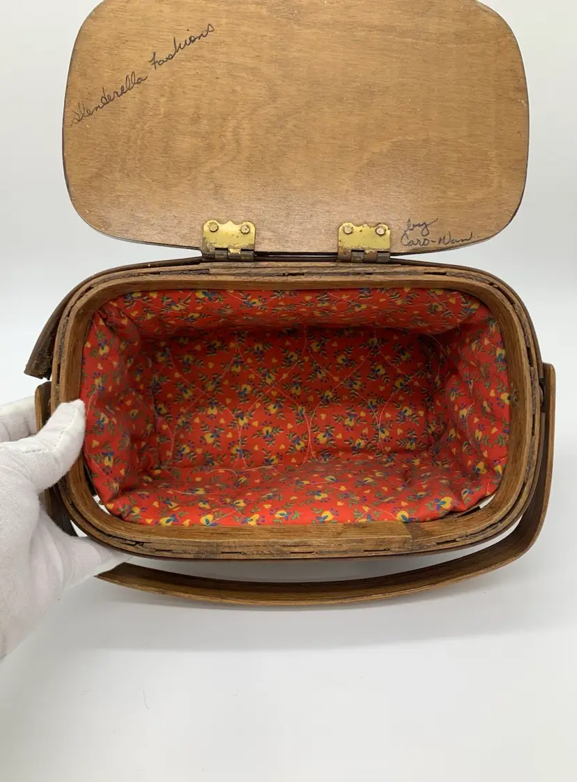 This beautiful MCM basket is a one-of-a-kind piece that will add a touch of vintage charm to any room. The woven painted mushrooms design, created by Caro Nan, is a perfect example of the artistic flair of the 1950s-1960s. The basket is made of wood with a fabric interior and features a wooden lid with metal hinges with a felt covered bottom. It is signed by the artist and handmade, making it a unique addition to any collection. The basket is a versatile fashion basket, purse,lunch basket, sewing basket, or as a decorative piece. It has a rectangle shape, measures 9" in length, 6" in height, and 5" in width, and weighs 1 Lbs & 3.7 Oz. This one of a kind adorable basket is in Excellent condition for its age see all pictures for details.