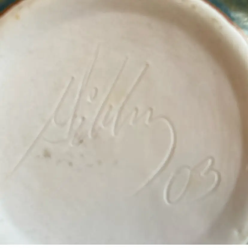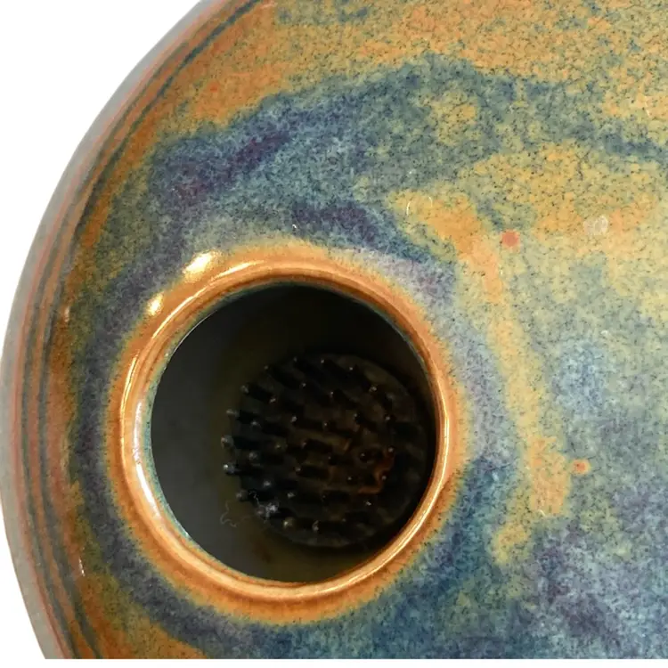 4” round 3/4” tall. This beautiful vase painted in greens and browns with a flower metal frog.