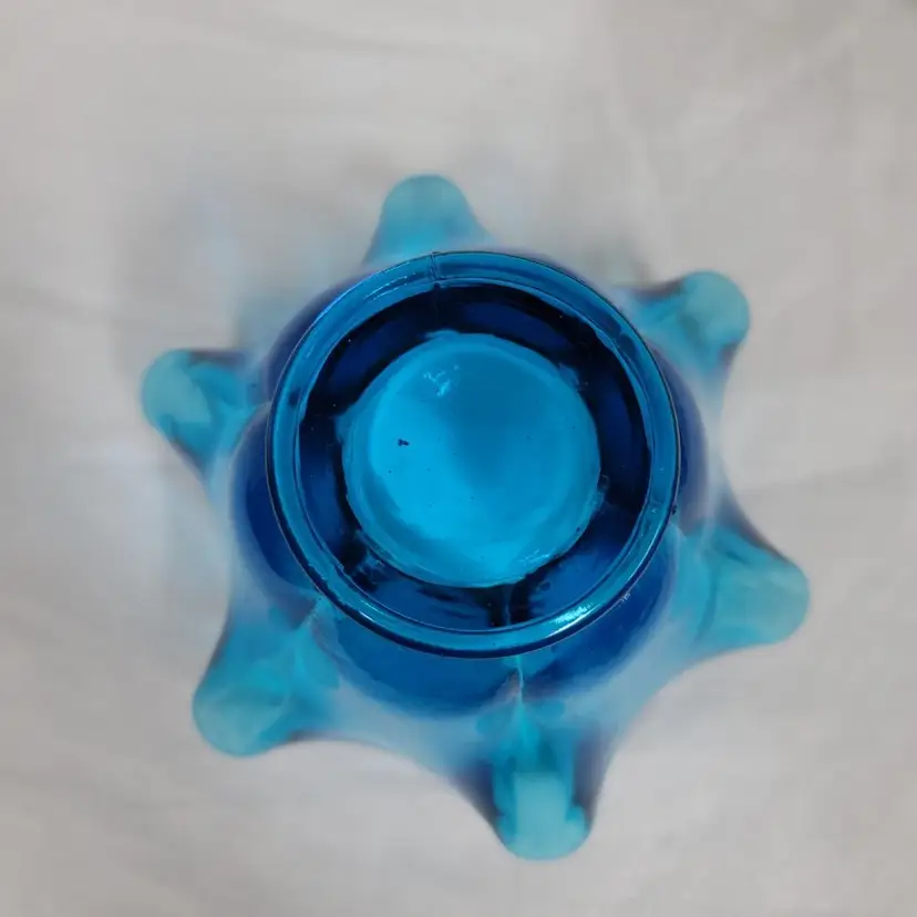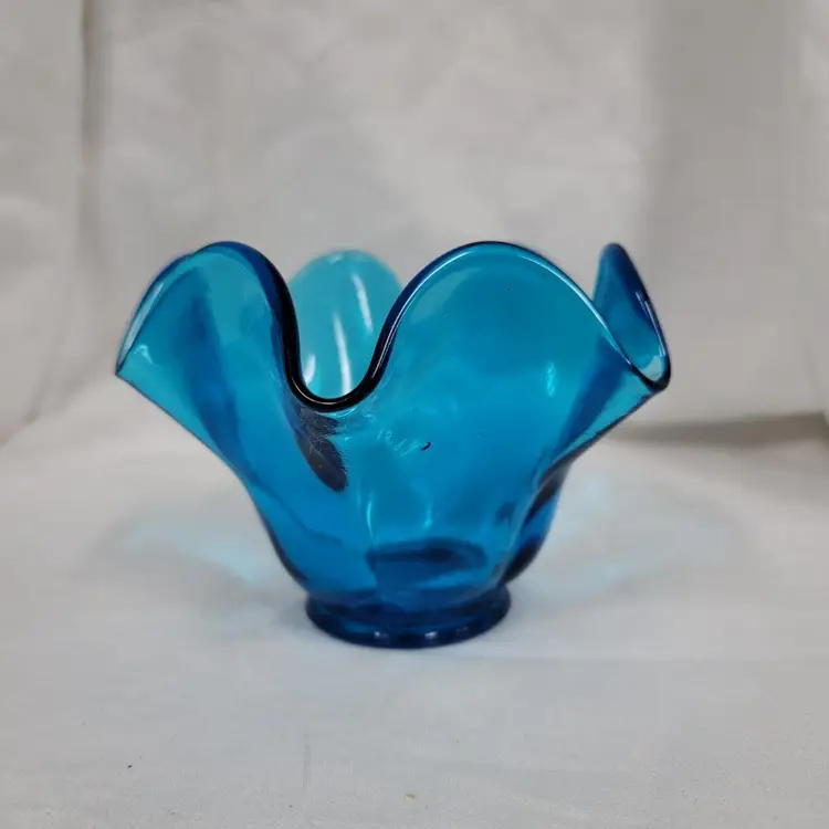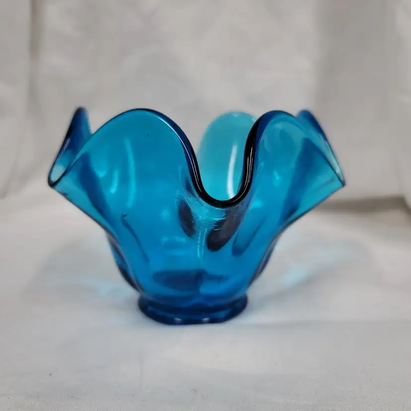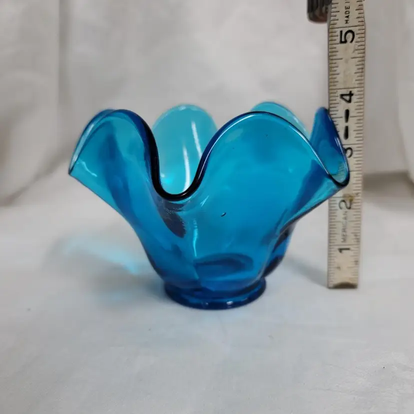 Vintage blue glass ruffle bowl by Viking. It has a six ruffle edge. Very good condition, no chips or cracks. The glass does have some inclusions. It measures approximately 5.5" x 3.25".