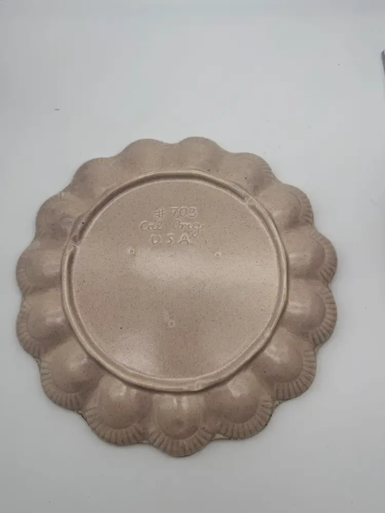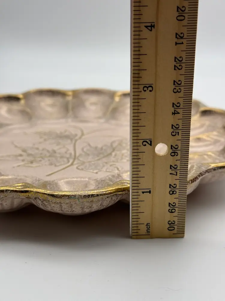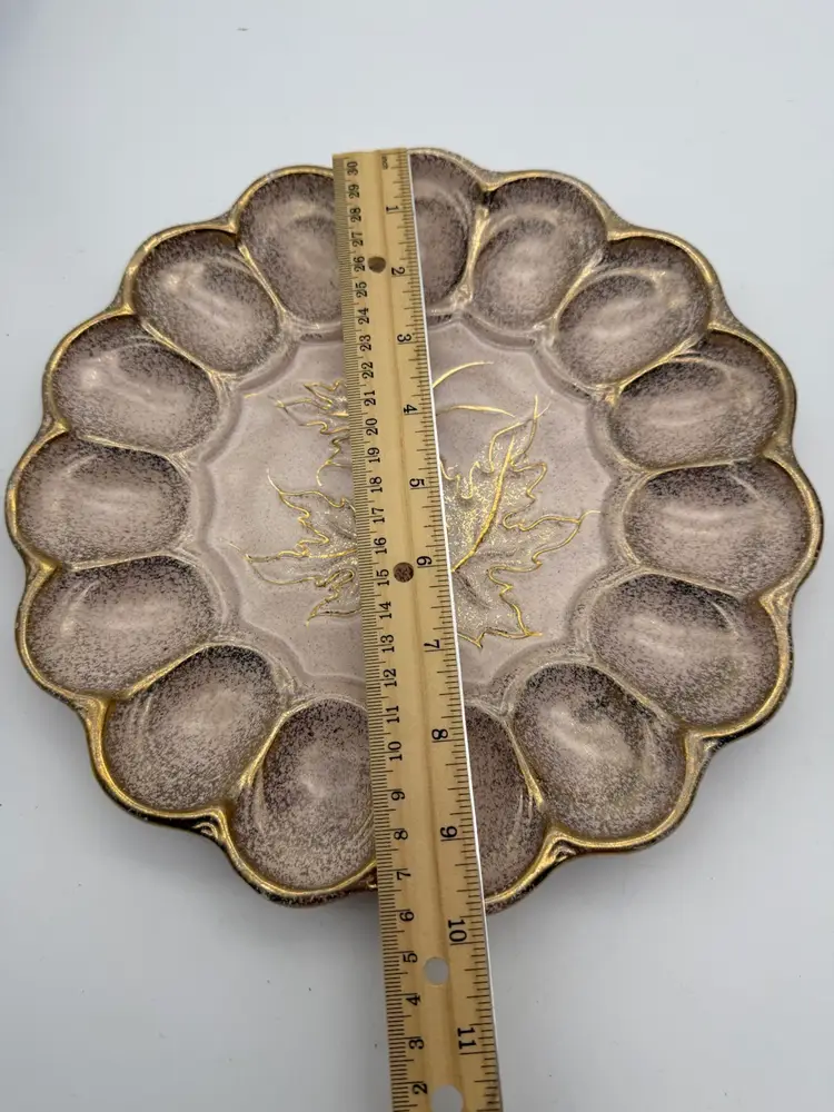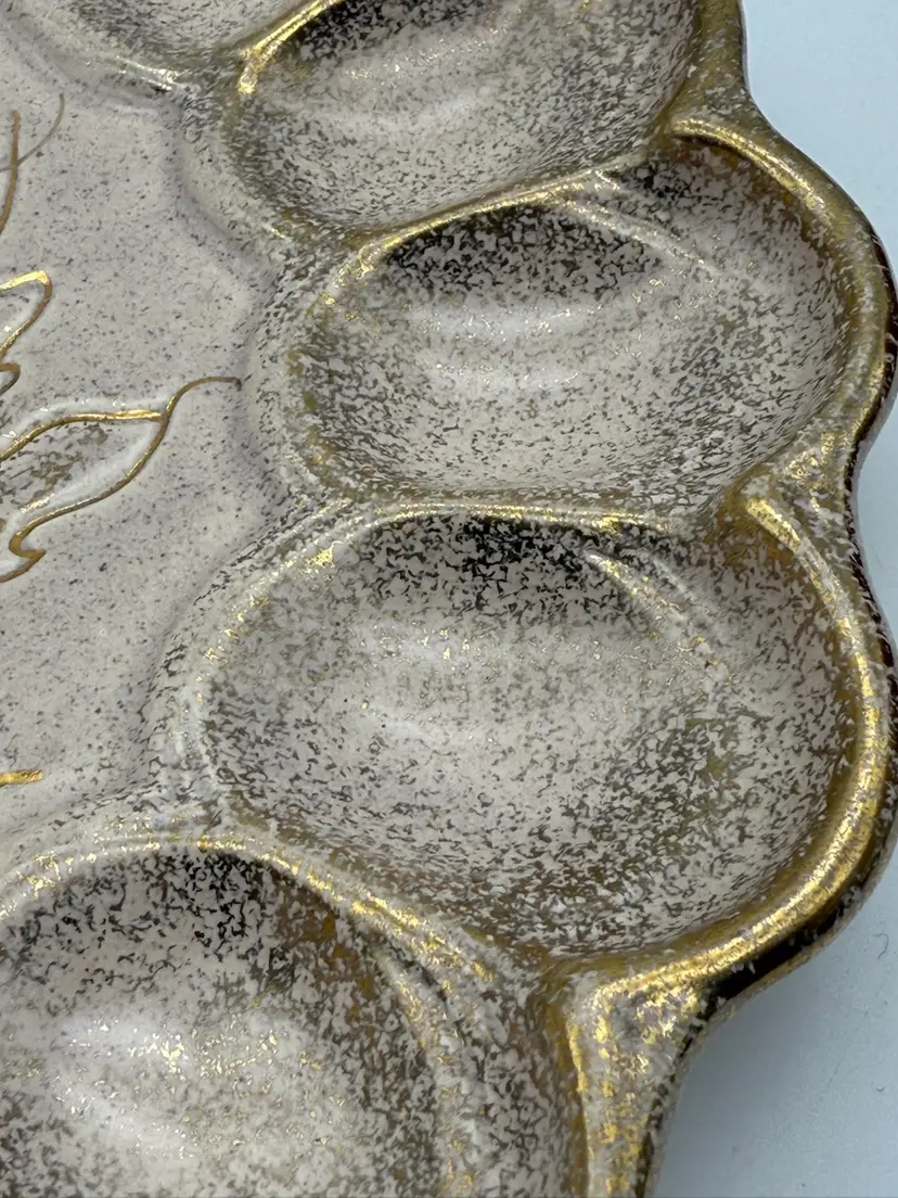 There is a small chip on the rim of the plate - it blends in due to the splattered paint design of the tray. Measures approx 10” wide and 1” tall.