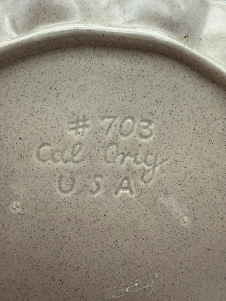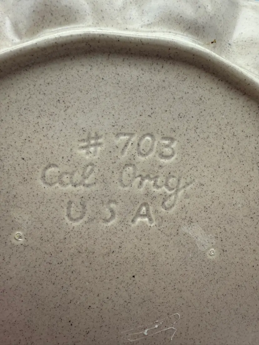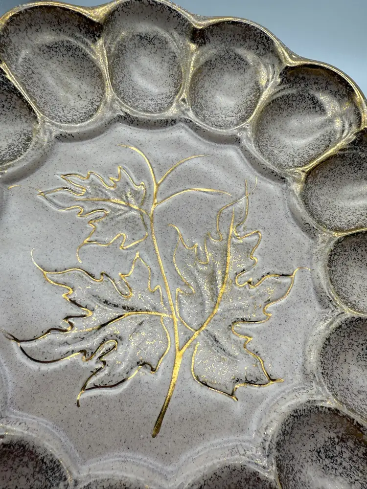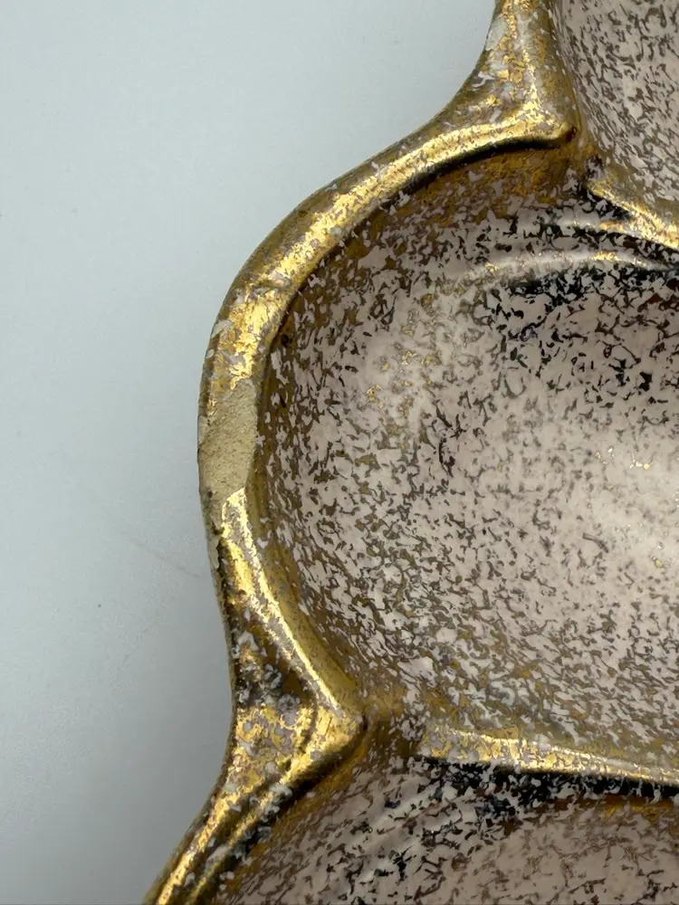 There is a small chip on the rim of the plate - it blends in due to the splattered paint design of the tray. Measures approx 10” wide and 1” tall.