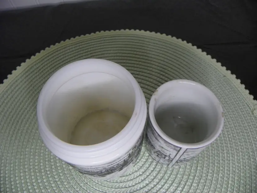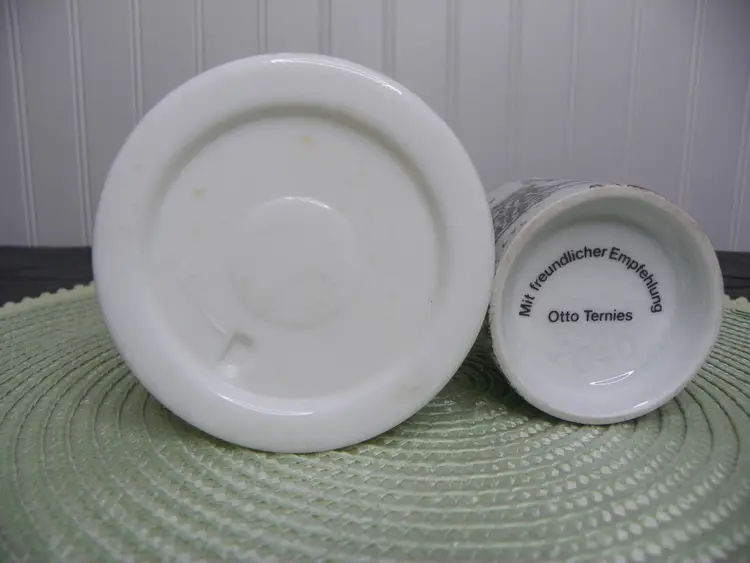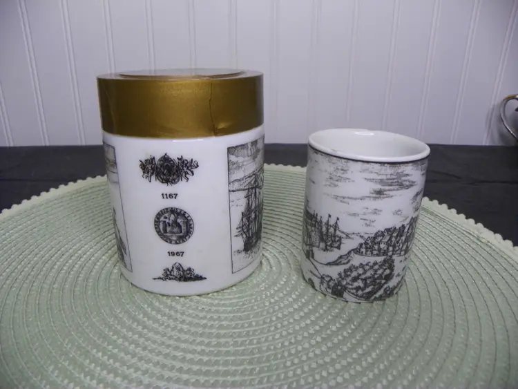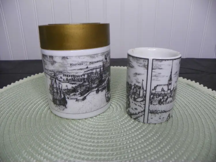 The Copenhagen canister features cityscapes in Denmark. The lid is plastic and does have a crack. The canister looks to be white glass (although listed as ceramic when researched) and does not have any chips or cracks (4"x3"). The German ceramic shot glass is from Altenkunstadt in Bavaria Germany. This piece is in good condition (3"x2"). Both pieces need a good cleaning and will be done prior to shipping.