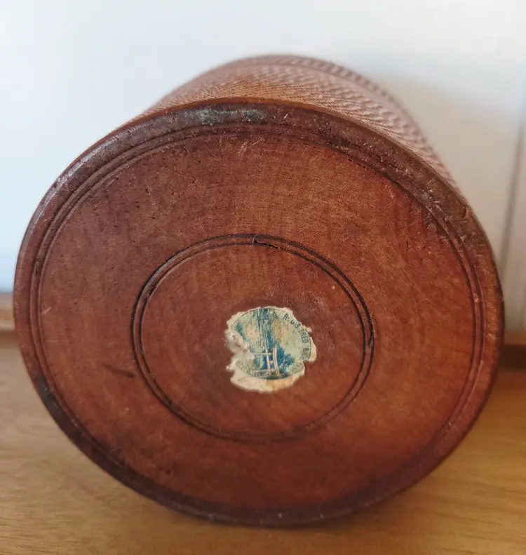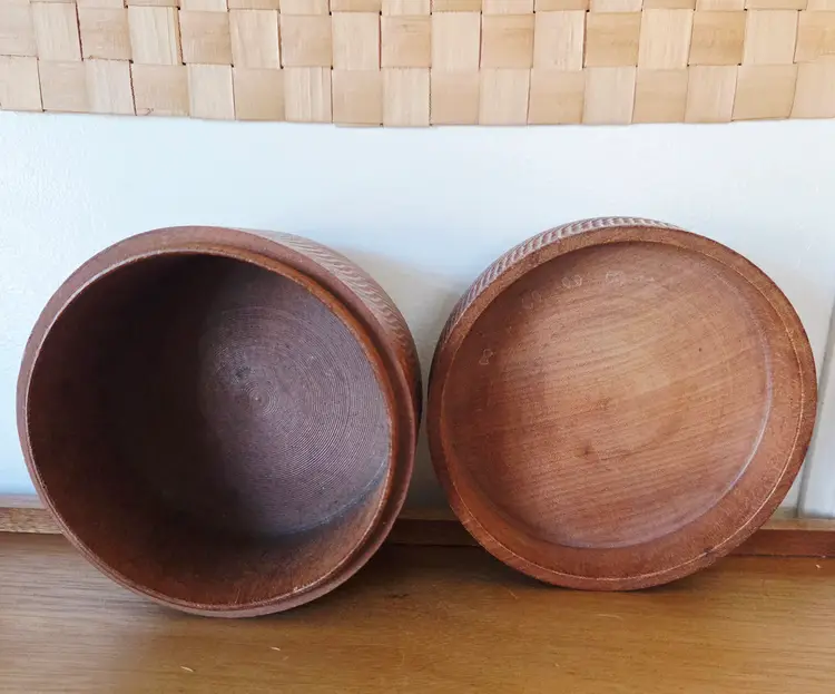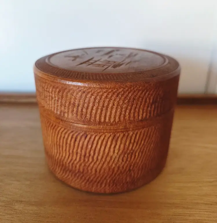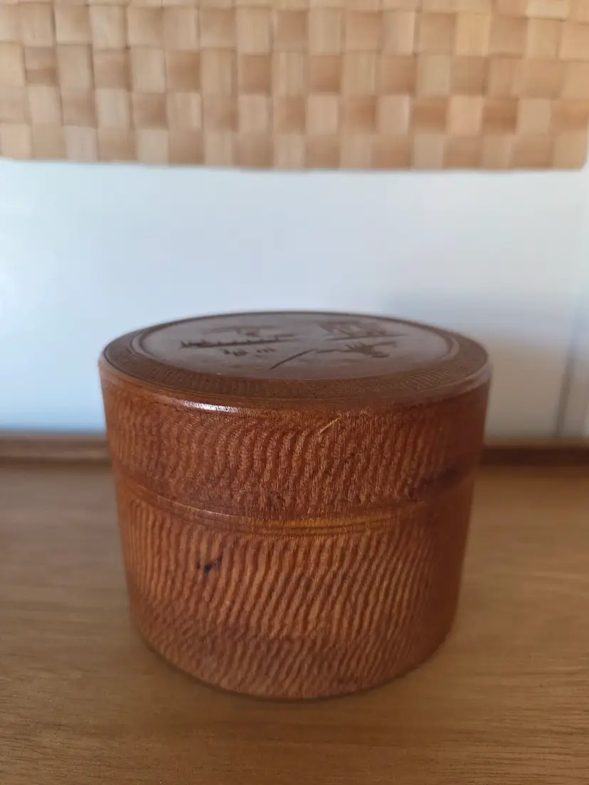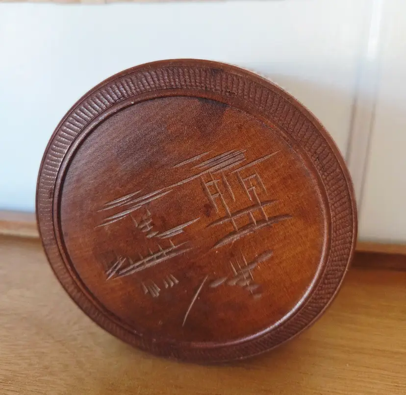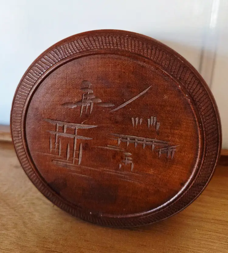 This item is a vintage Japanese hand-carved wooden lidded box, often used as a souvenir container for sets of small tea coasters. This item is missing the coasters. Material: Carved wood, made in the mid-20th century. Design: Features intricate carving on the lid, depicting scenes in Japan. Purpose: Primarily serves as a decorative storage piece or a keepsake box. Dimensions: Approximately 3 inches tall and 4.5 inches in diameter.