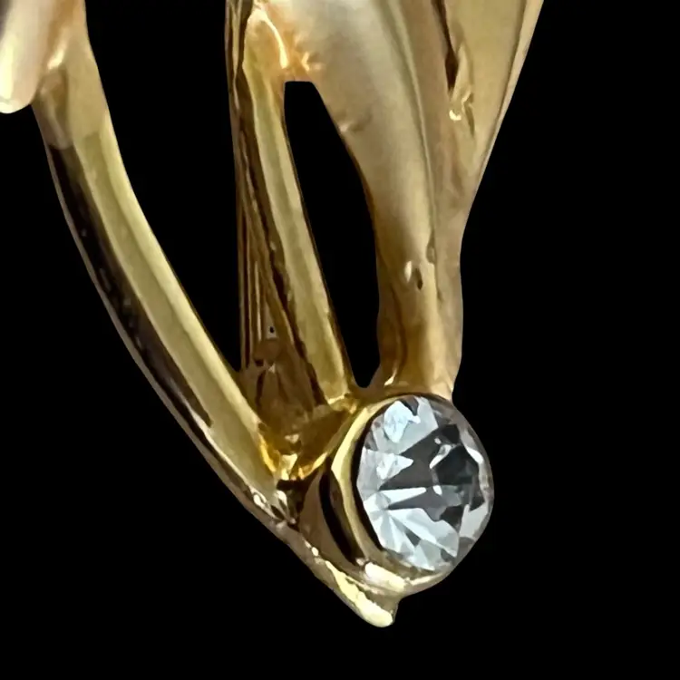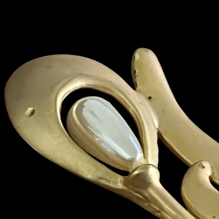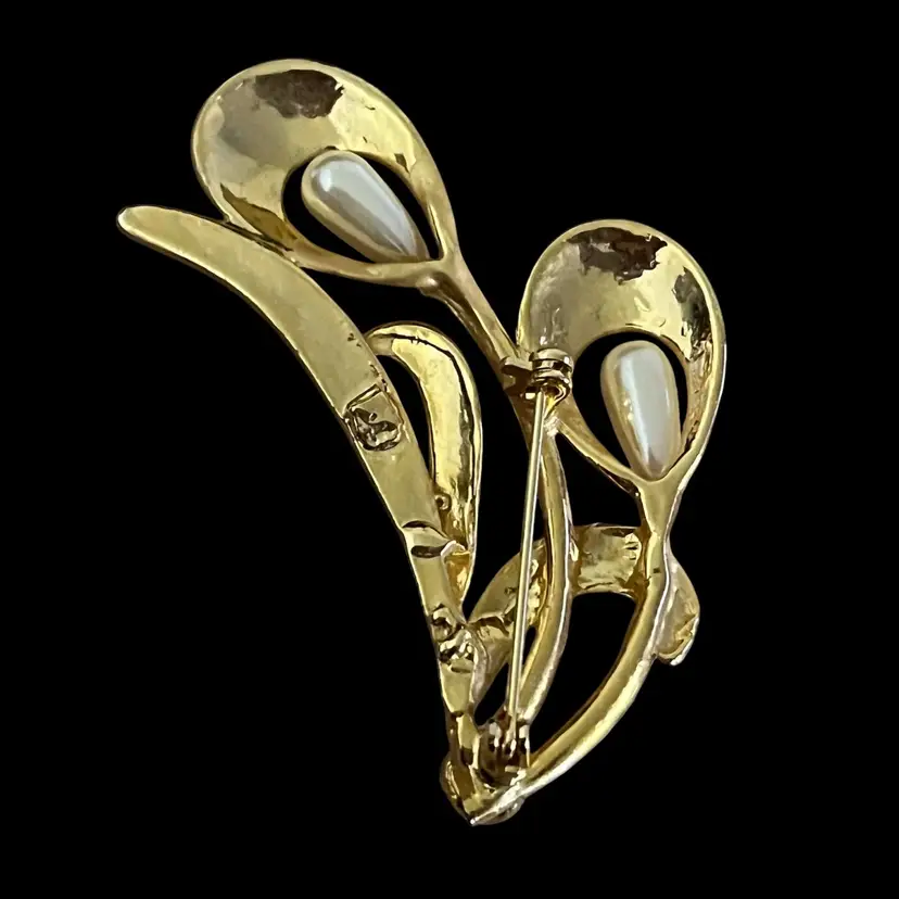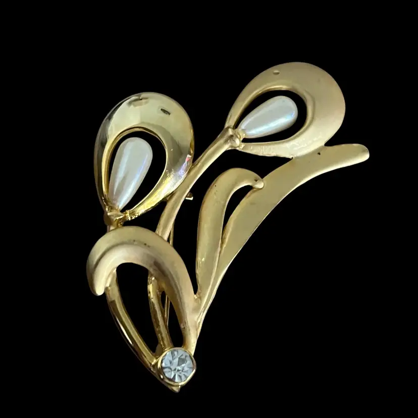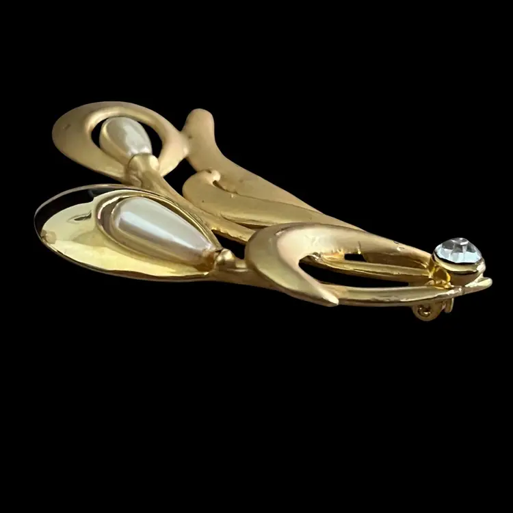 Lovely brooch with sweeping mid-century modern lines! Gold tone with 2 teardrop shaped faux pearls and a clear rhinestone. The gold tone has both shiny and matte finishes. An absolutely gorgeous piece!