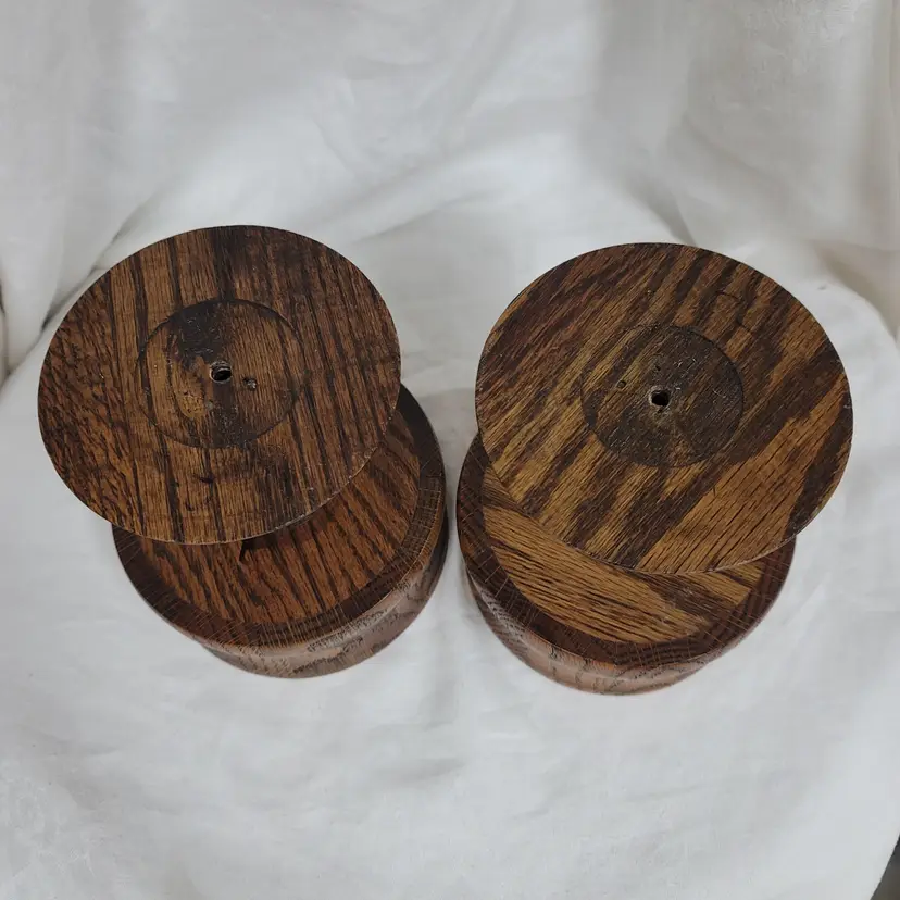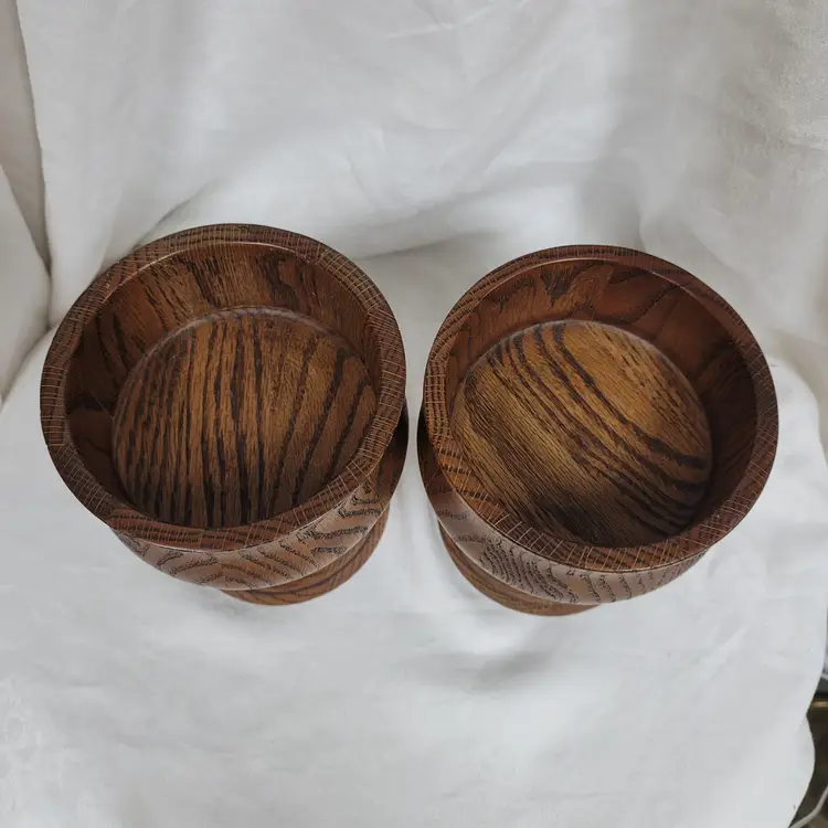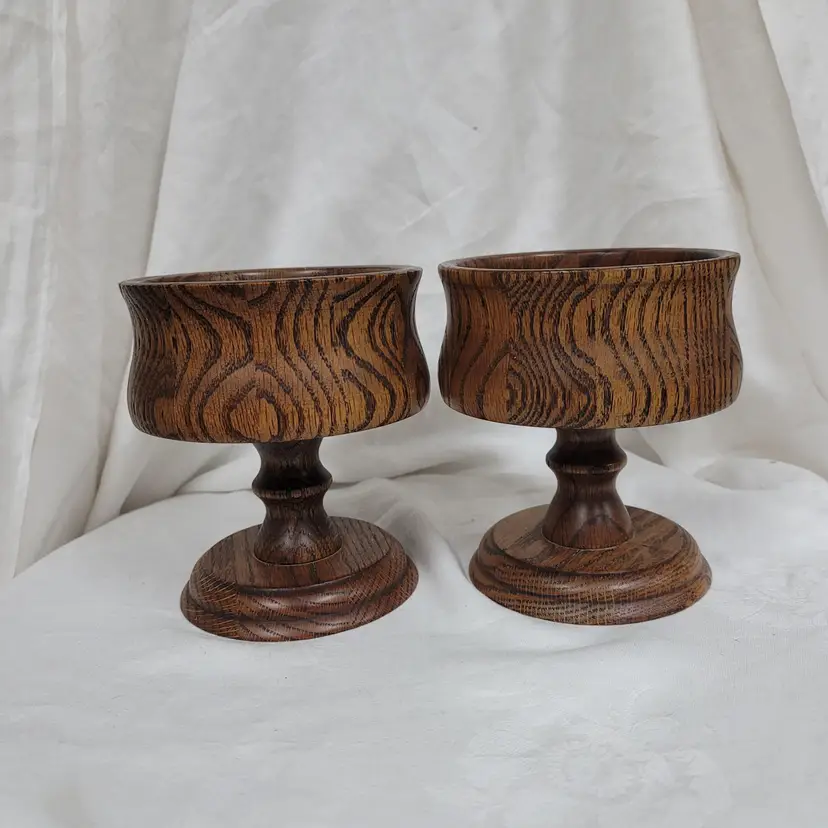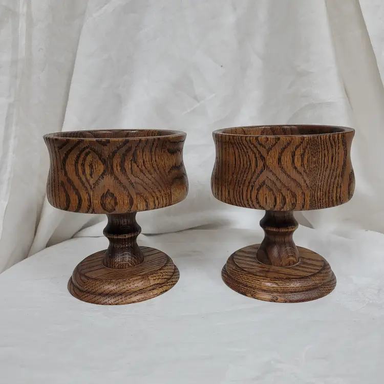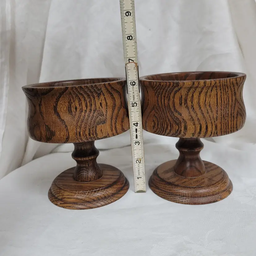 Vintage MCM wooden bowls on pedestal. Strong grain look, walnut color. Very good condition. Set of two. One measures approximately 6.25" x 5.5"