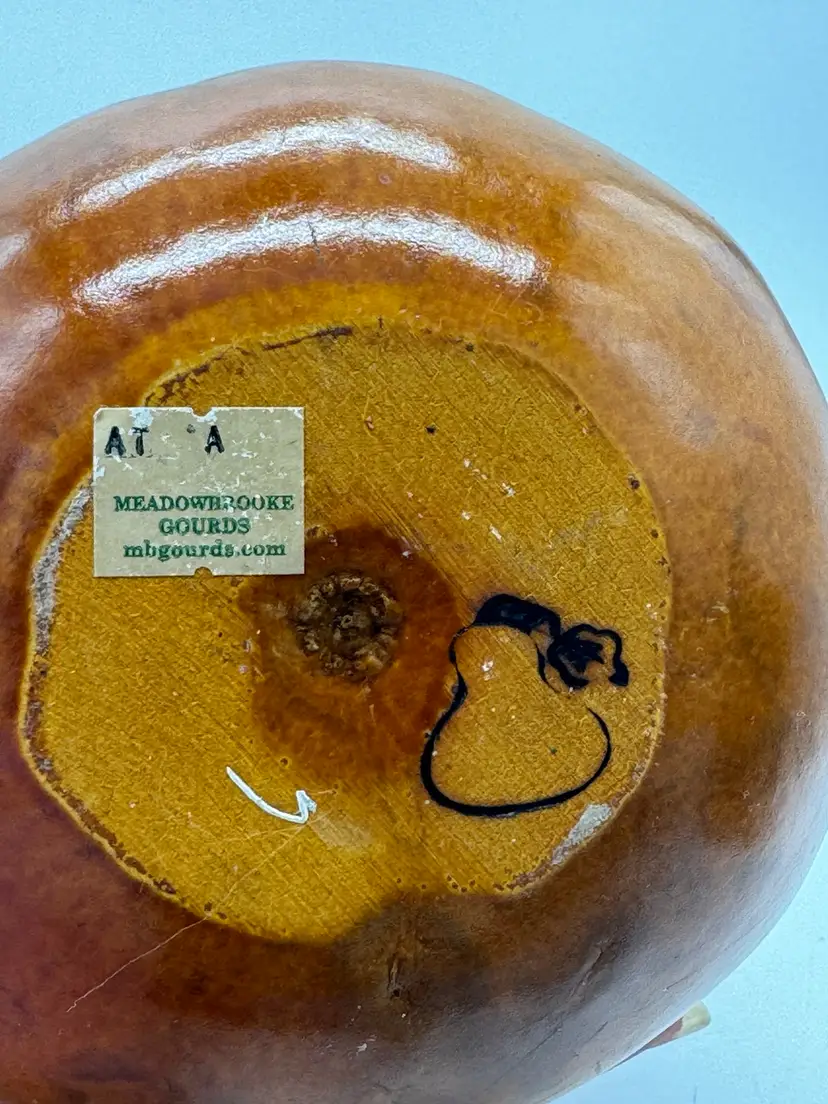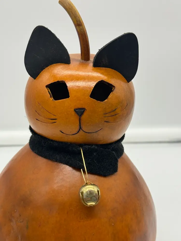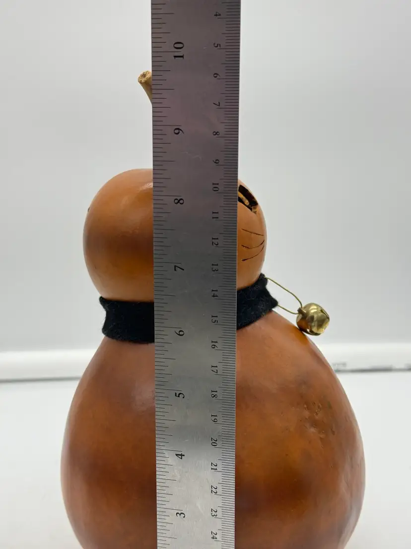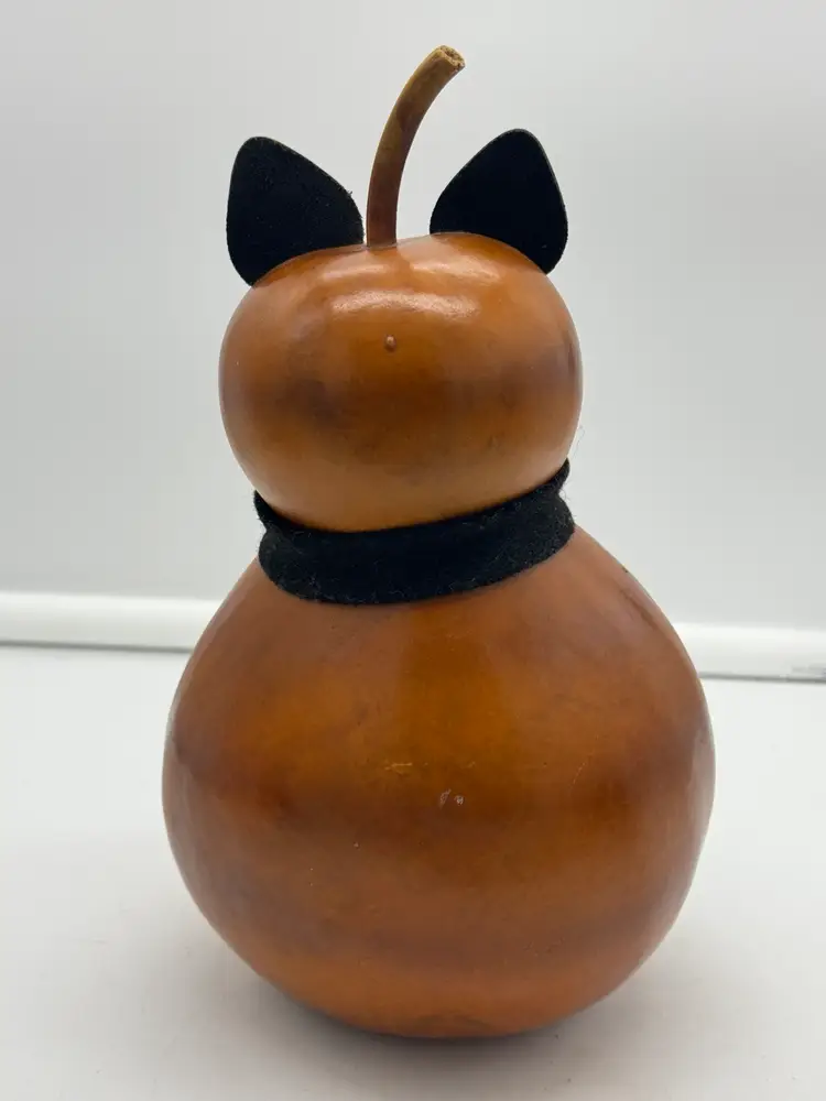 Adorable dried gourd in the shape of a cat with felt collar and working bell. The eyes are carved out, the other features are carved in to the gourd. Measures 10 inches tall. One of the leather ears is loose-just needs a dab of glue.