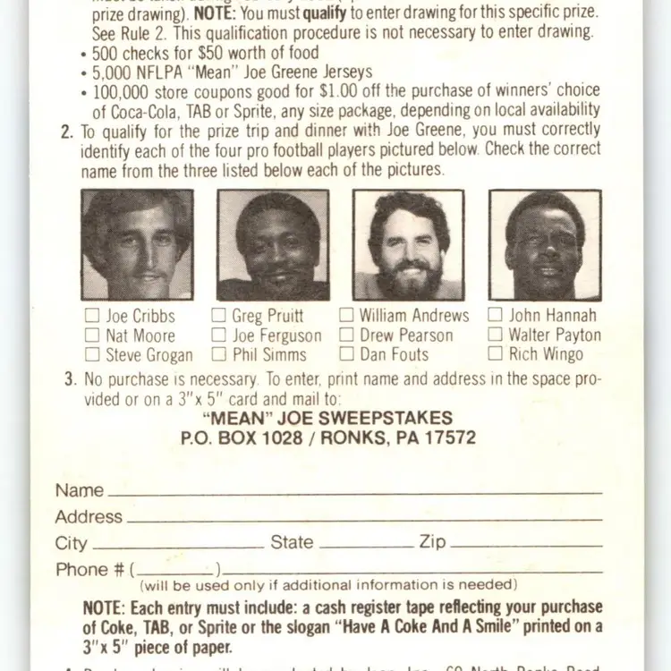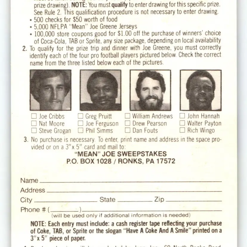 This Coca-Cola bottle hanger featuring Mean Joe Greene is a must-have for any football fan or Coca-Cola collector. Produced in 1981, this item is a great addition to any collection from the 1960s to now. The hanger was manufactured in an unknown location and is unmodified. It is a great piece of ephemera and paper collectible that is sure to spark joy in any collector's heart. Don't miss out on this unique item!