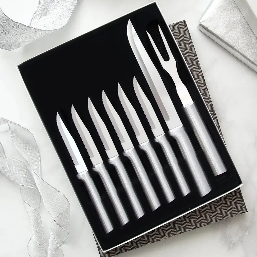 This set includes six Serrated Steak Knives, a Slicer, and a Carving Fork. We use surgical-grade T420 high-carbon stainless steel for a blade that retains its edge and remains incredibly sharp. Available with a choice of silver satin aluminum handle and black resin handle. Finger guard on knives protects fingers while cutting. Carving Fork has long tines to assure you never lose the grip on your food. Backed by our Lifetime Guarantee: Rada Mfg. Co. will replace any product manufactured by our company returned to us due to defects in material or workmanship.