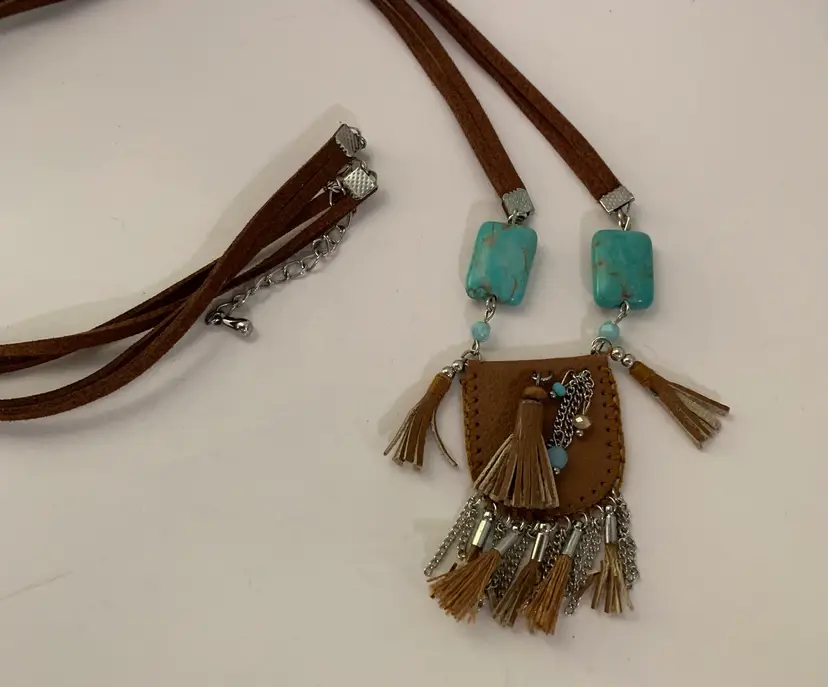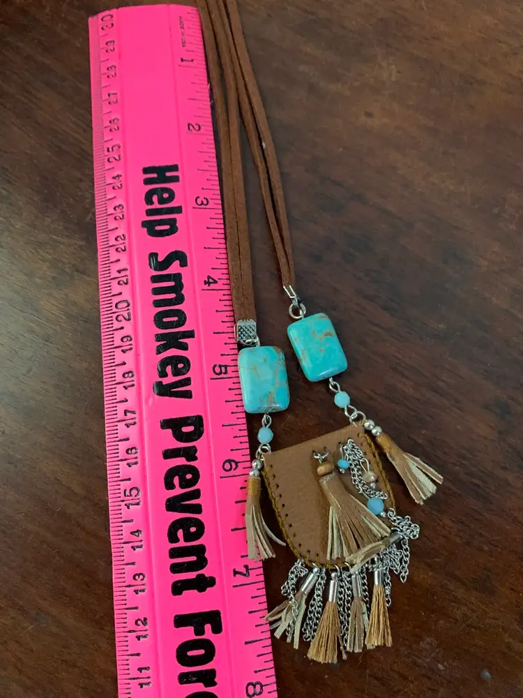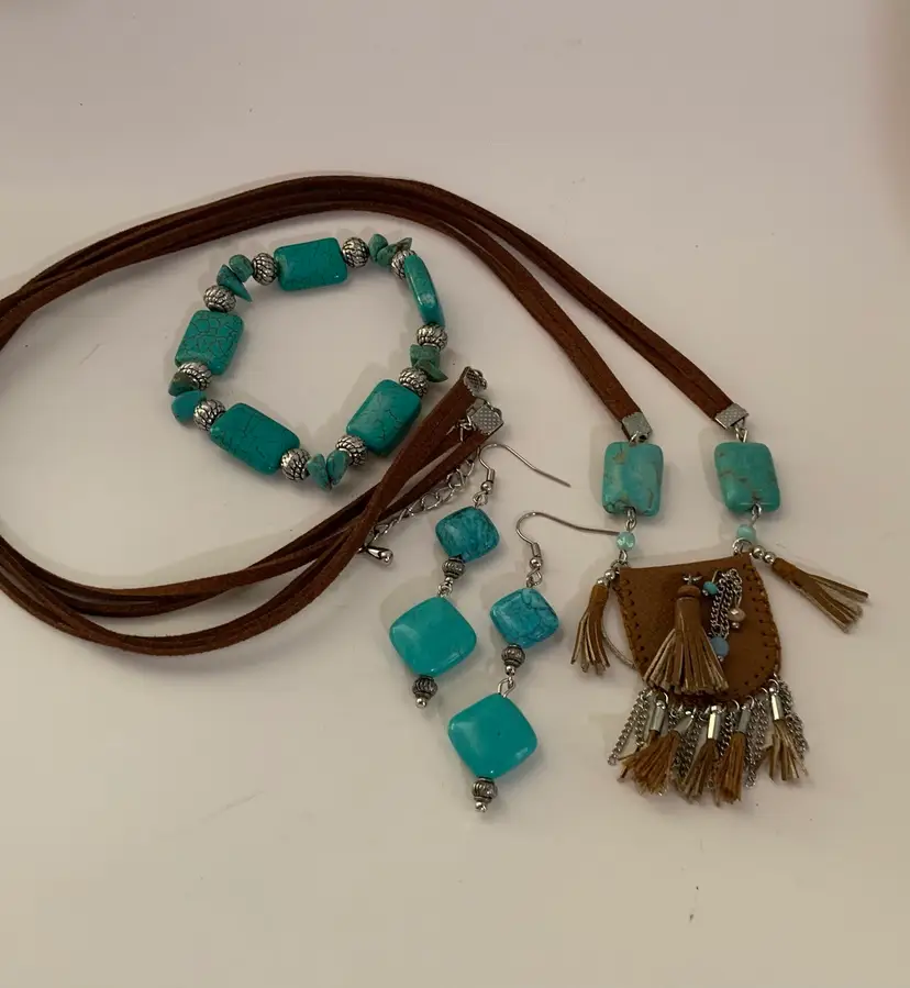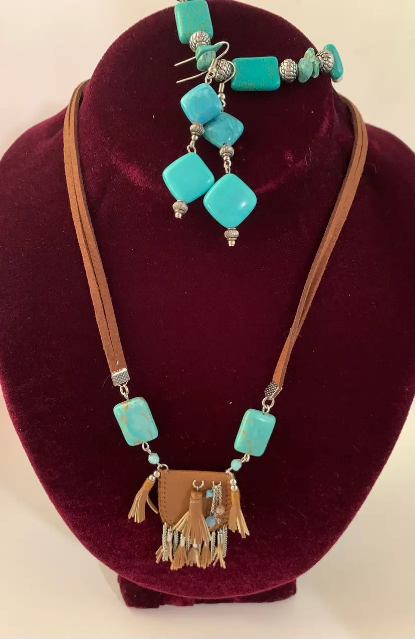 Medicine bag charm with leather necklace and turquoise blue howlite beads. Matching fish hook style pierced dangle earrings and stretch bracelet are made from turquoise blue howlite and silver toned metal beads. Findings are silver toned metal. All items are handmade by me. Measurements included in photos.