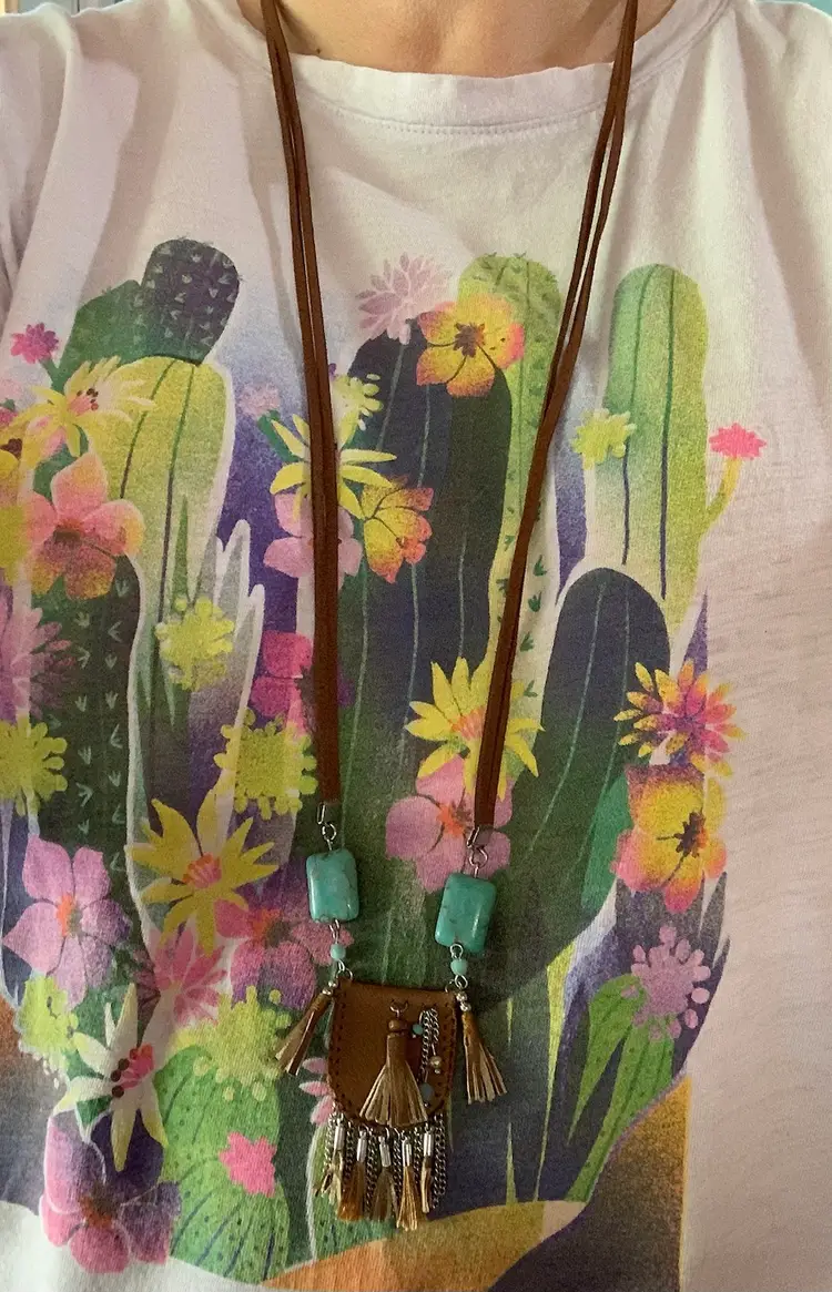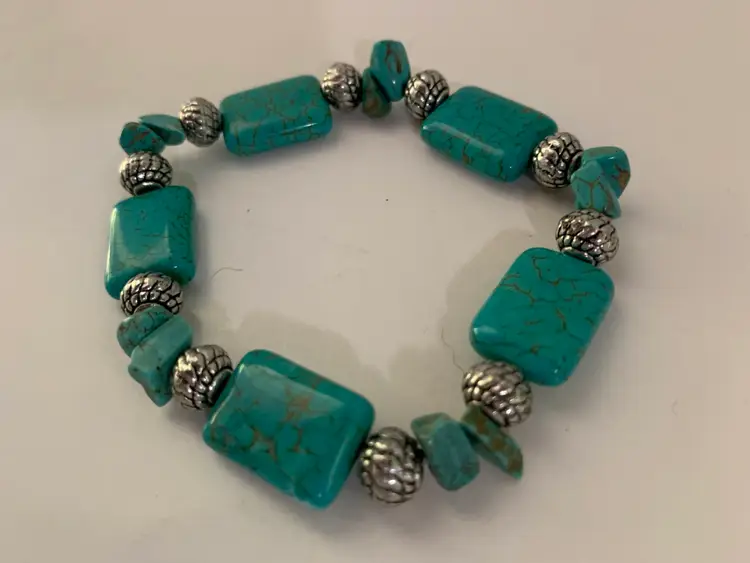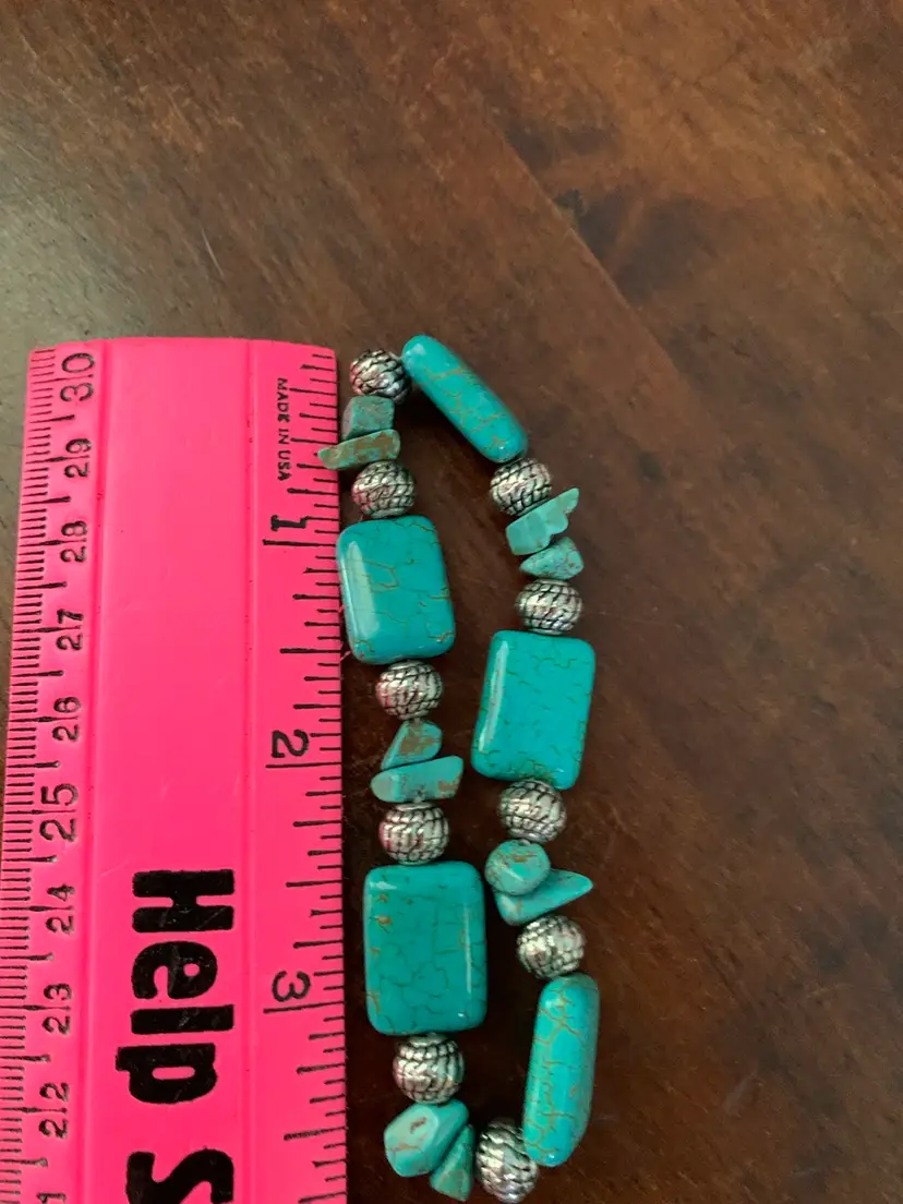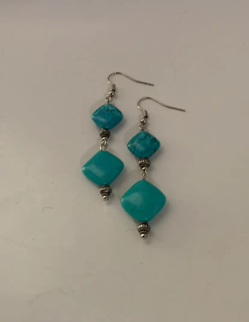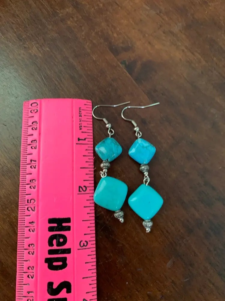 Medicine bag charm with leather necklace and turquoise blue howlite beads. Matching fish hook style pierced dangle earrings and stretch bracelet are made from turquoise blue howlite and silver toned metal beads. Findings are silver toned metal. All items are handmade by me. Measurements included in photos.