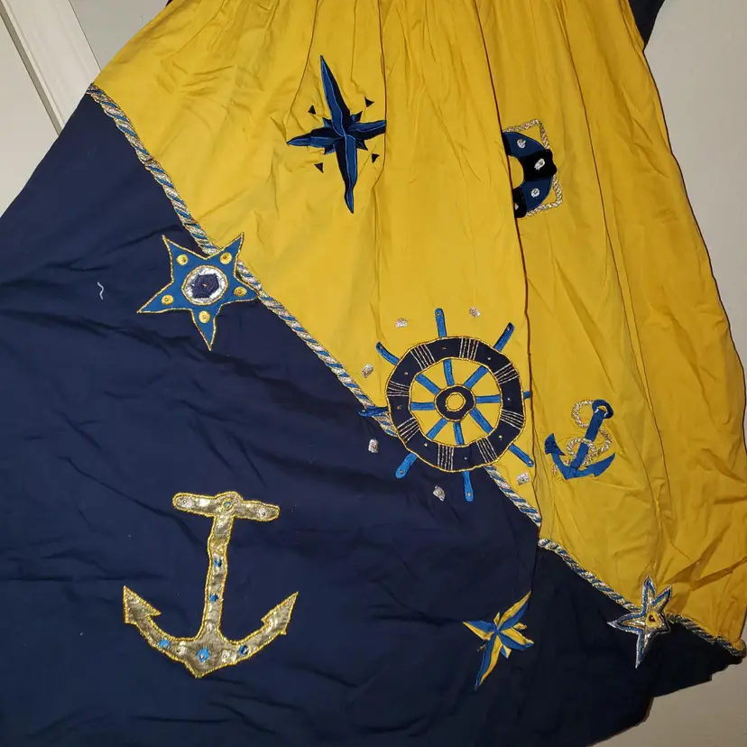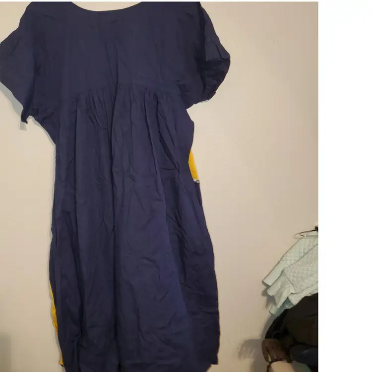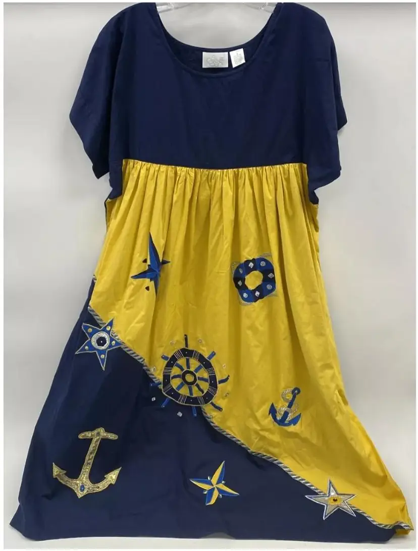Get ready to sail away with this fun blue and yellow embroidered nautical muumuu lounge dress from Go Softly Patio. Perfect for casual occasions, this shift-style dress with short sleeves and collarless features a pullover closure and is made of 100% cotton, which makes it machine washable. The dress is available in size M and is perfect for any season - winter, summer, fall, or spring.