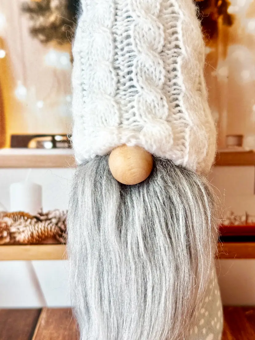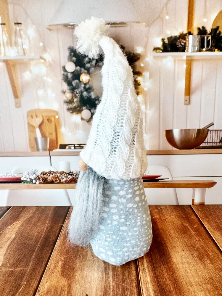 This Medium sized gnome is white and a light bluish grey.. The hat is one of a kind and was made from a white ribbed up cycled sweater. It has a fun hairy pom pom on it The body has white ovals in different sizes with a grey blue background.printed on a cotton fabric. Lastly, a big wooden nose that gives it a lot of personality!