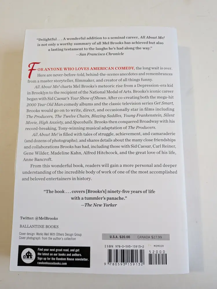 All About Me! is filled with tales of struggle, achievement, and camaraderie (and dozens of photographs), and shares details about the many close friendships and collaborations Brooks has had, including those with Sid Caesar, Carl Reiner, Gene Wilder, Madeline Kahn, Alfred Hitchcock, and the great love of his life, Anne Bancroft.