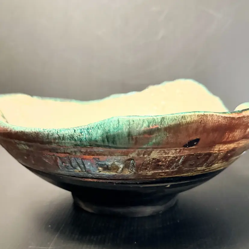 • A striking crackle glaze in a soft peach/cream base with a vibrant turquoise/aqua rim and accents.
