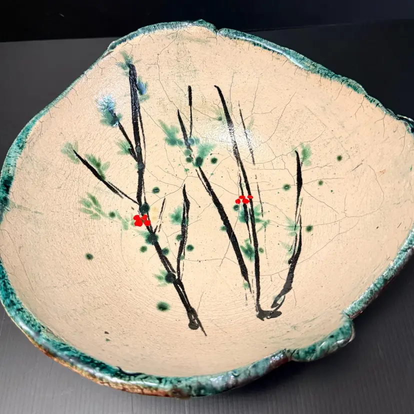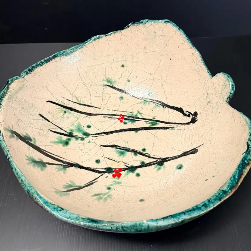 • Delicate painted decoration: black brushstroke branches or reeds, small green foliage dots, and bright red berry-like accents—giving it a simple, nature-inspired, almost East Asian aesthetic feel.