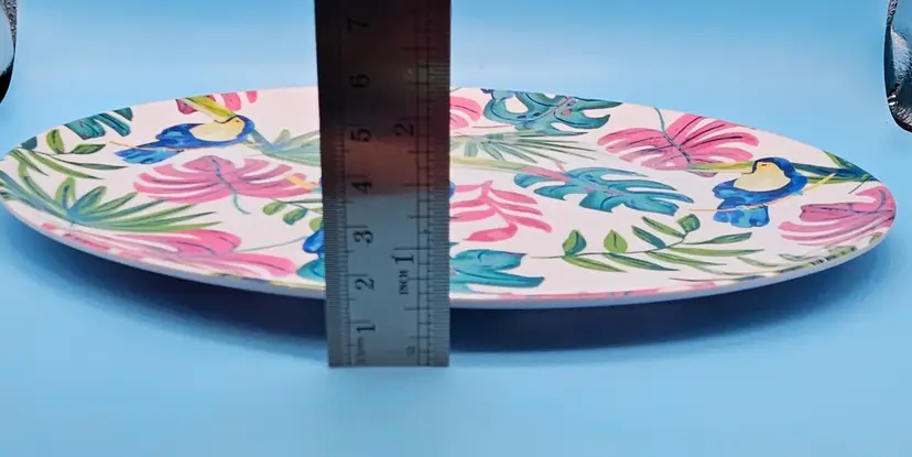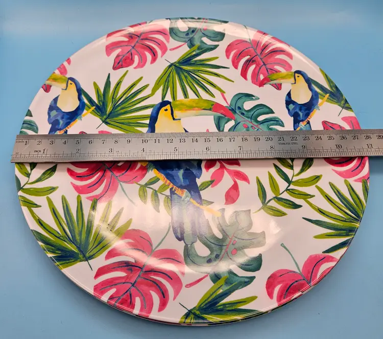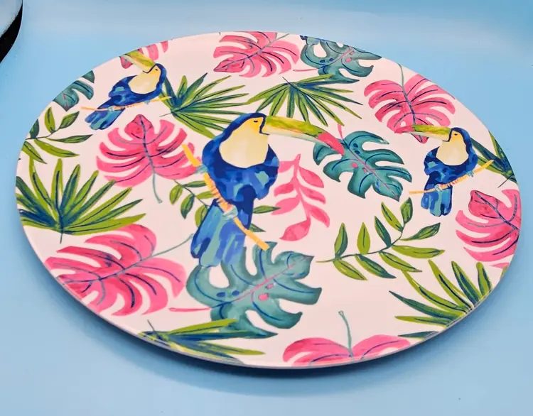 Model: #253382 2301 Melamine Toucan Blue Green Pink 11” Large Dinner Plate. Set of 3.