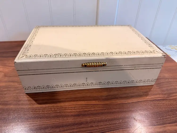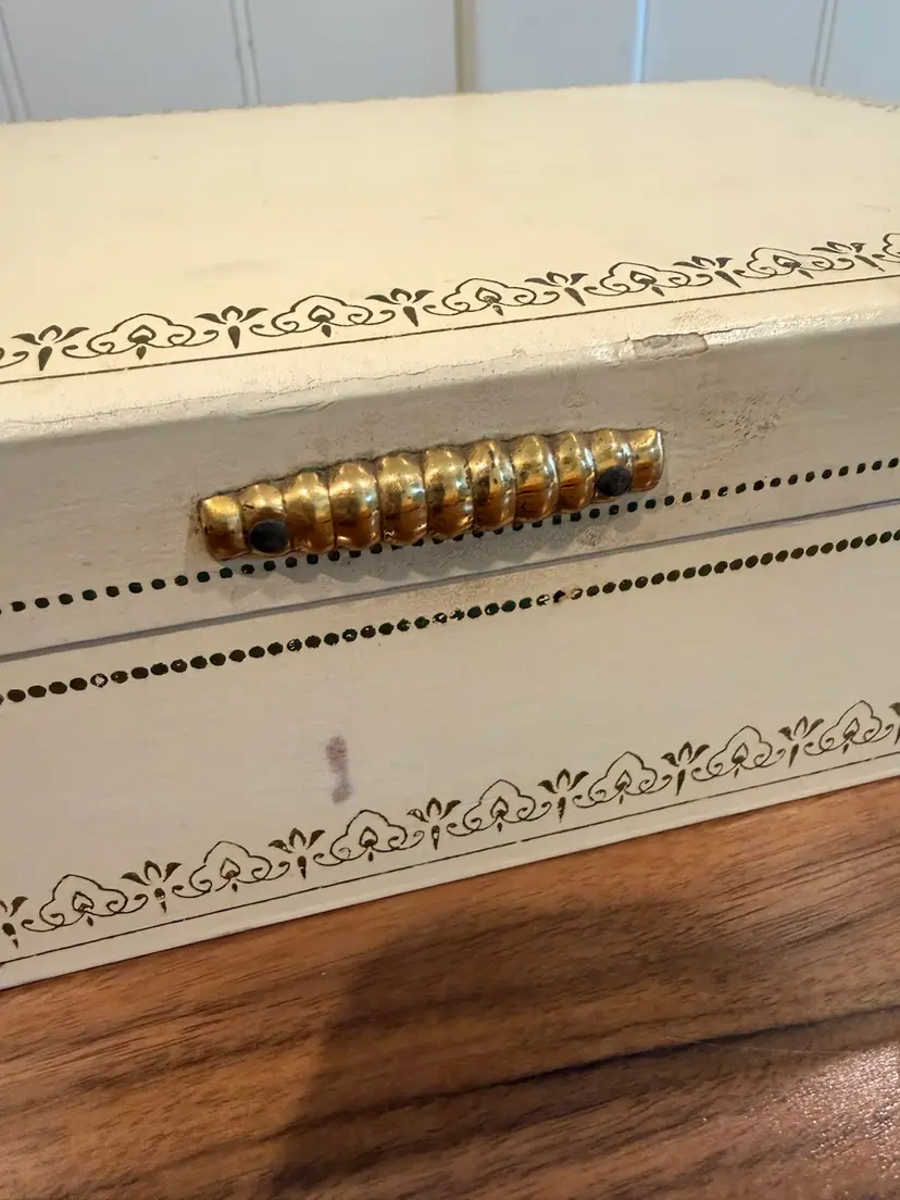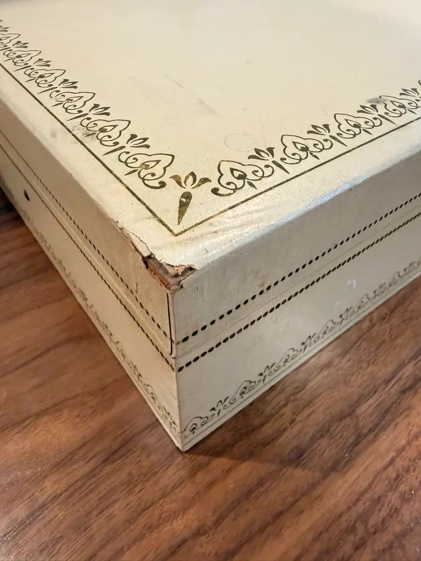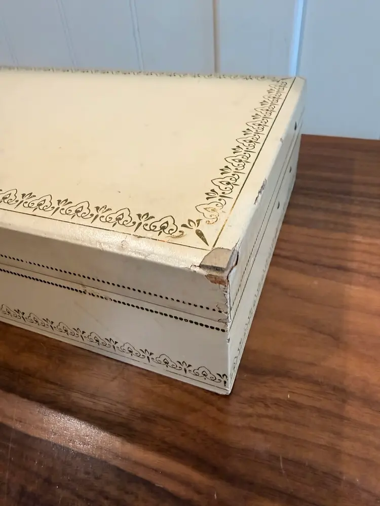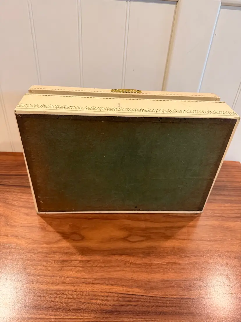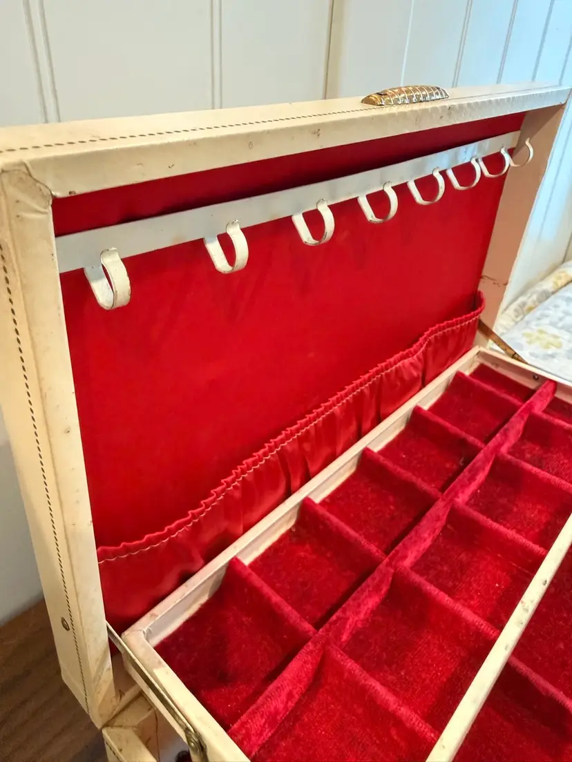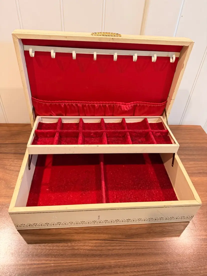 Mele jewelry 2-tiered box (red interior), used condition, some wear to corners. Inside very clean. Love the gold tone handle. 12.5” wide, 8” deep, 3.5” tall.