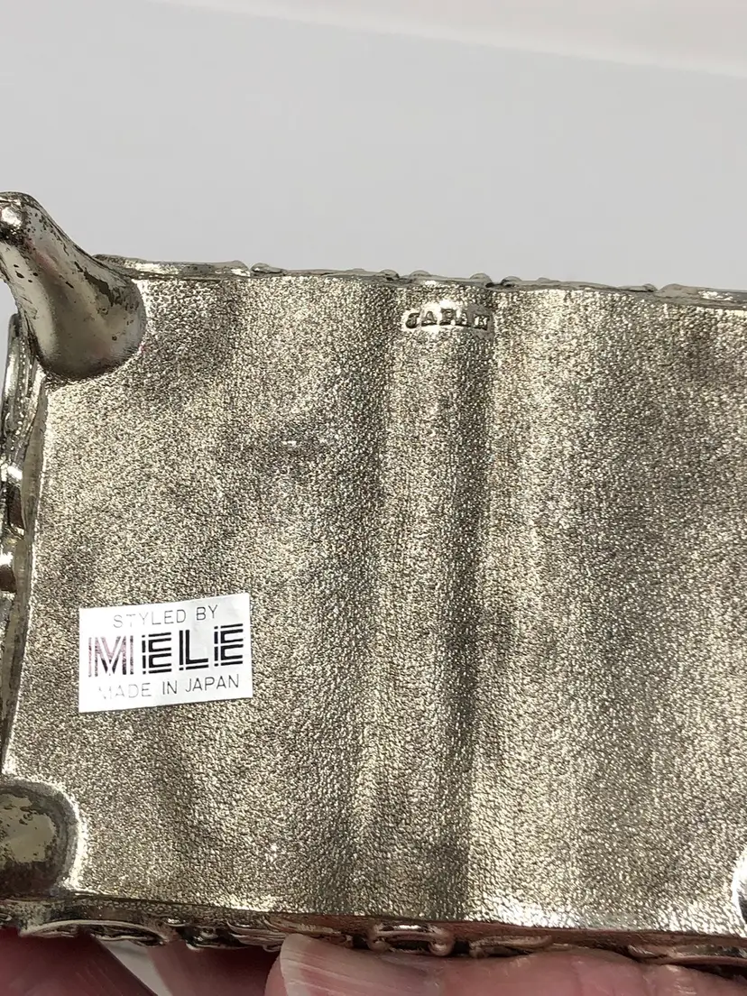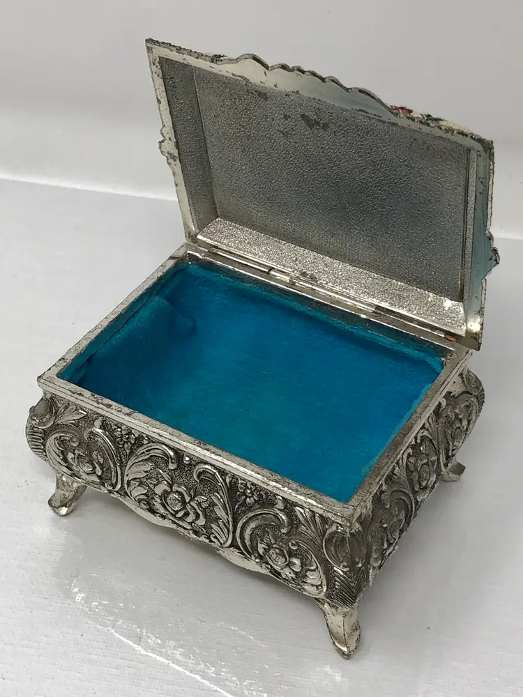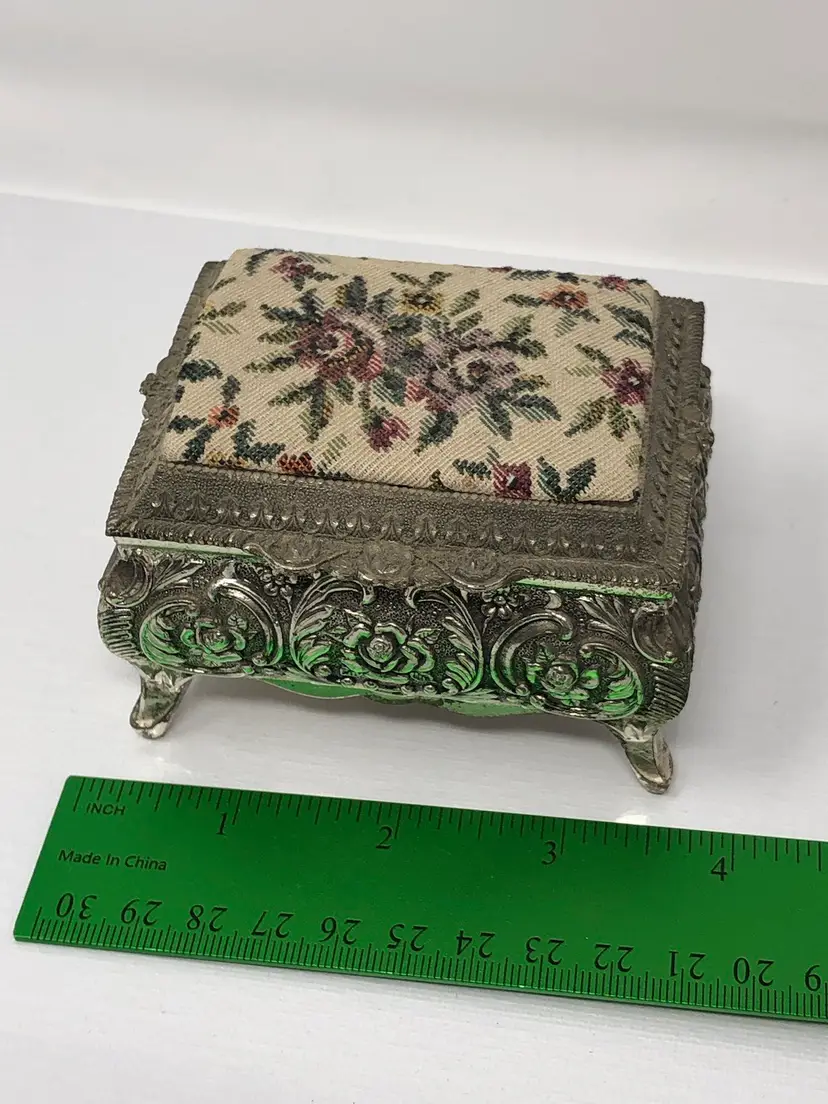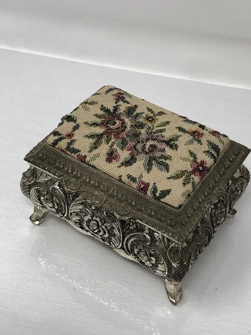 3 1/2" x 2 1/2" metal jewel box with rose tapestry lid and raised rose design metal work and 4 small legs. Turquoise colored lining inside, original label styled by MELE Japan. Some patina, but otherwise good condition.