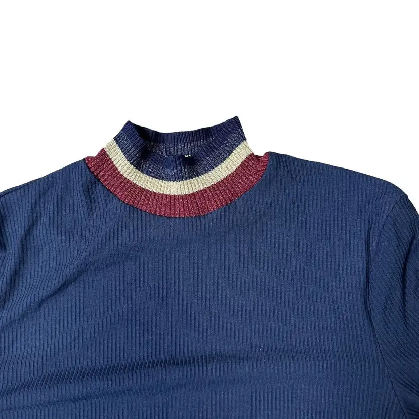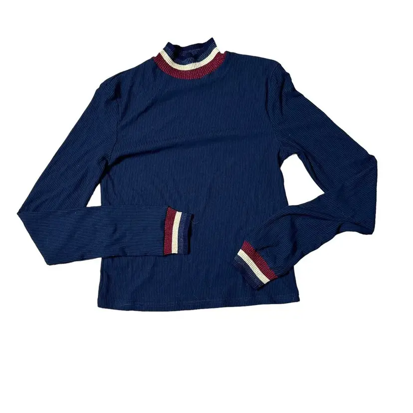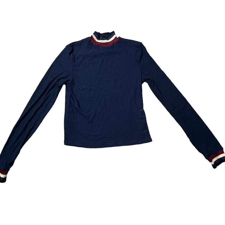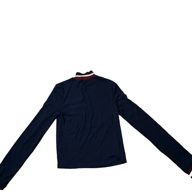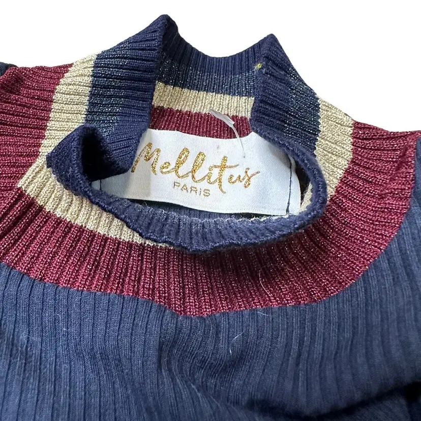 Mellitus Paris French Fashion Long Sleeve Ribbed Sweater Light weight sweater / t-shirt Women's large Navy blue with maroon and gold trim Excellent condition slim fit Cotton, Polyester, Spandex