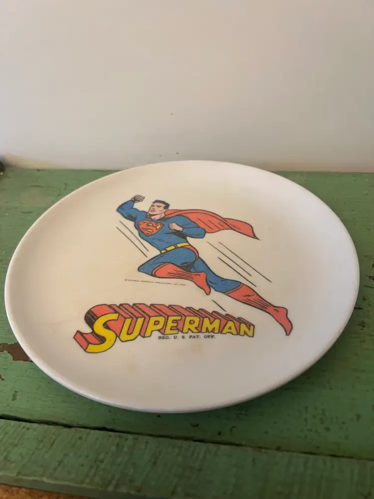 Vintage Superman Man of Steel Melmac plate 8" across. Boonton Holding Co 1966 Plate has scratches from silverware, fading and general wear