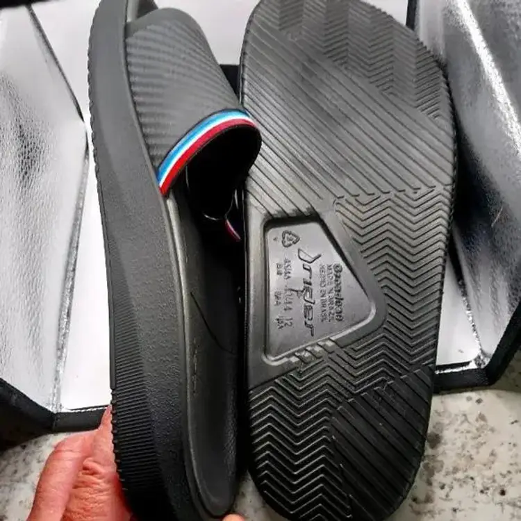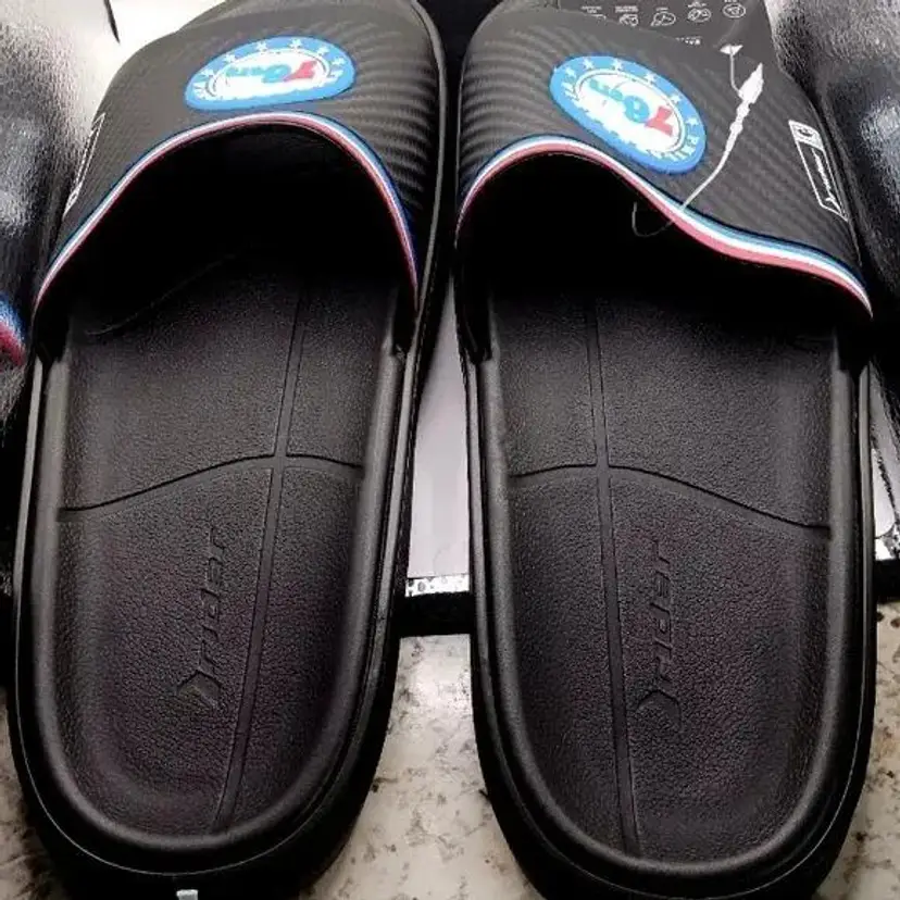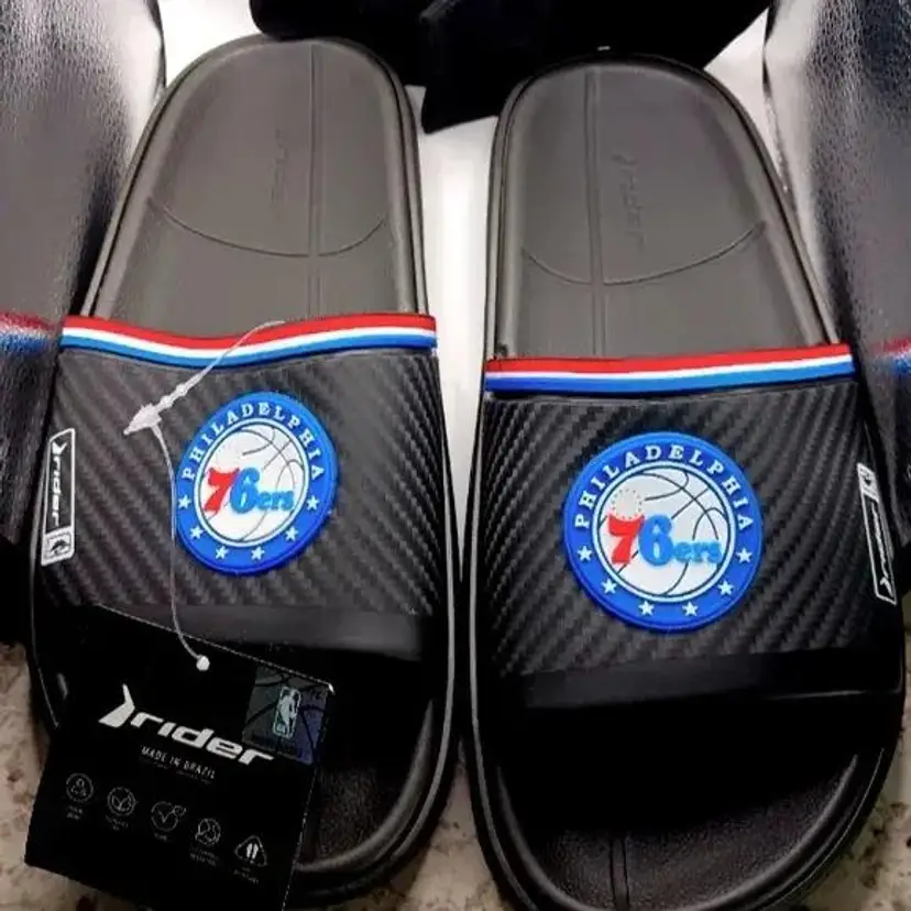 New with tags Men's Philadelphia 76ers Slides-Sandals, Size 12. Color is black with 76ers logo on front. Officially licensed item by Rider Heavy duty rubber Slides great for beach, pool or just any outdoor activities. Included are New and never worn pair of socks Size 6 to 12 - black in color