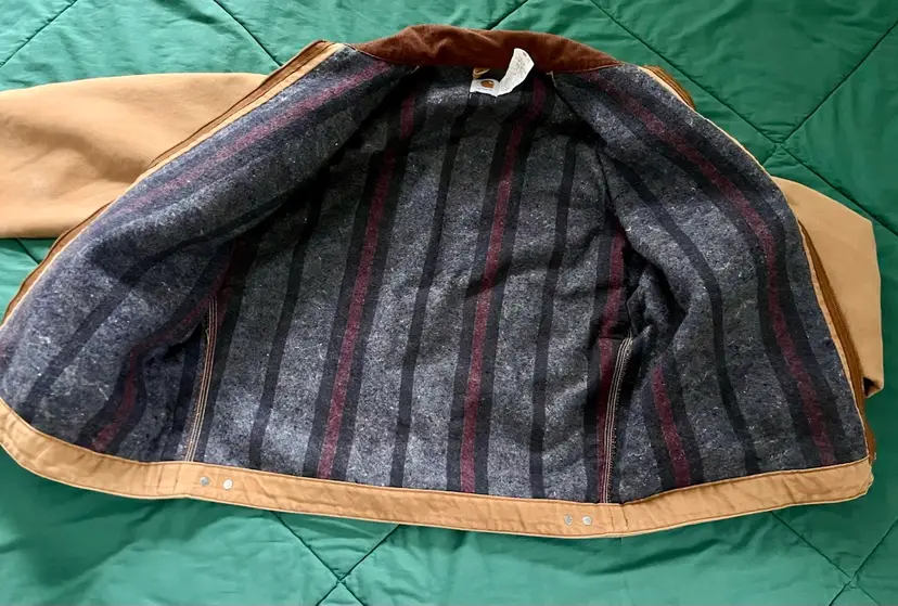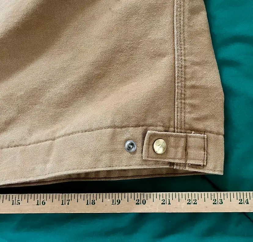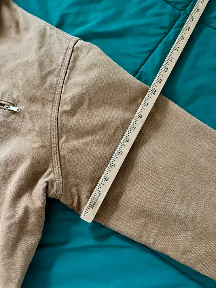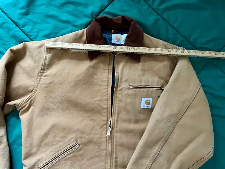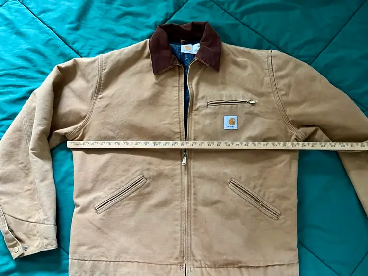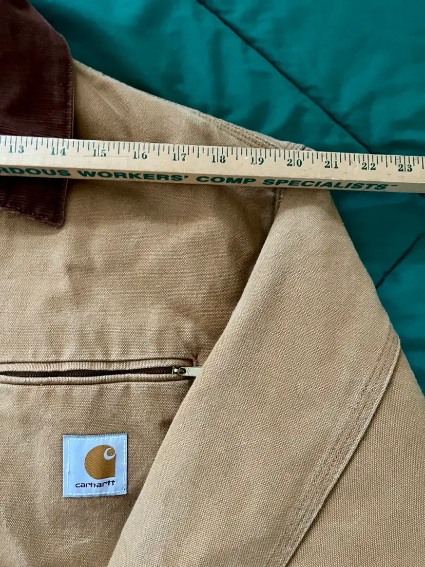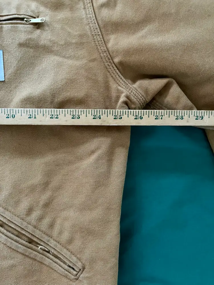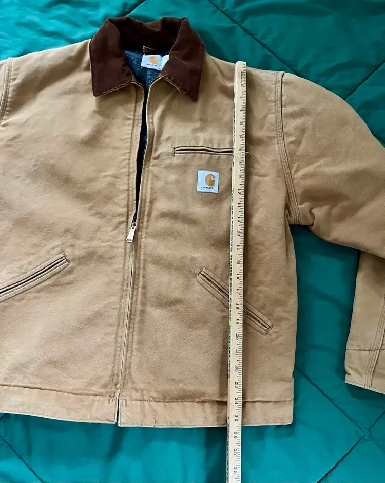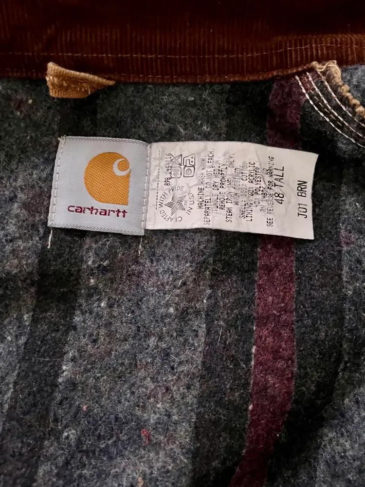 The Mens Size 48 Tall ~ J01 Carhartt Duck Detroit Jacket is a durable workwear piece designed for outdoor work. Made with a cotton canvas outer shell and lined with a blend of acrylic and polyester, this mid-length jacket features interior and exterior pockets, a spread collar and heavy duty zip closure. The brown color and Carhartt logo accents give it a classic yet rugged look, perfect for the colder seasons. With a boxy fit that allows for layering, this jacket, made in the USA, is a timeless piece that combines functionality with a touch of heritage and outdoor style.