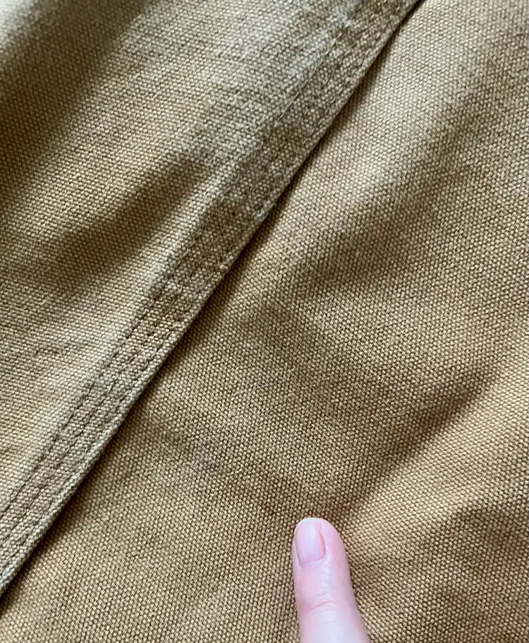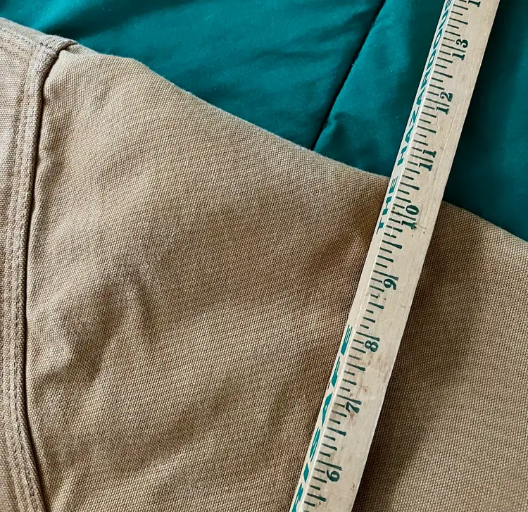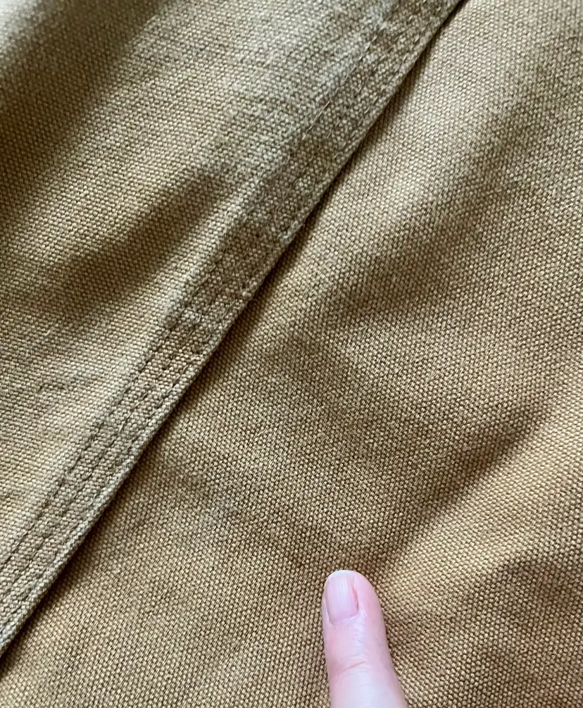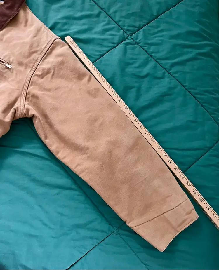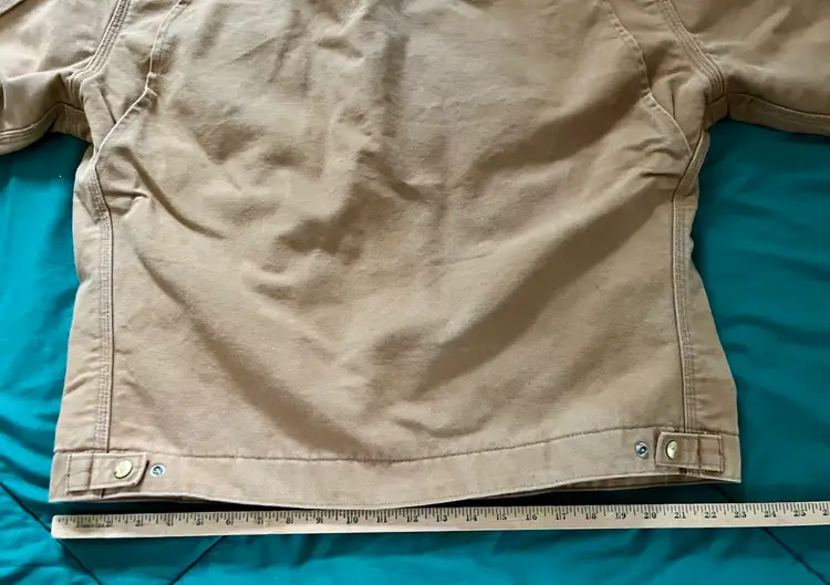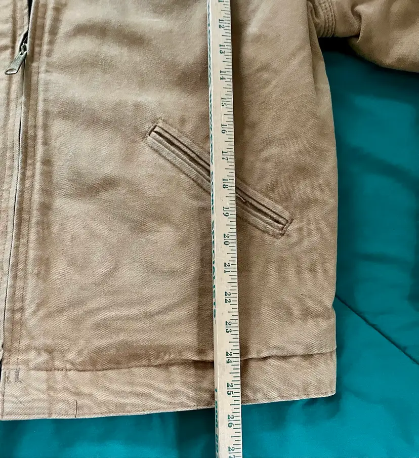 Please look at all the photos prior to deciding to make a purchase. Any item pre-owned, and worn, most likely will show some wear or stains. This jacket has slight stains as some but possibly not all, are pointed out. This appears to have been gently worn ~ with a great deal of “life” left. Those who need more length will find it so in the Tall Version as seen in the photos of the flat measurements. Buyer, however, is strongly encouraged to review the photos and decide for themselves its condition. Prior to a purchase, questions not answered in photos, details, description are welcome.