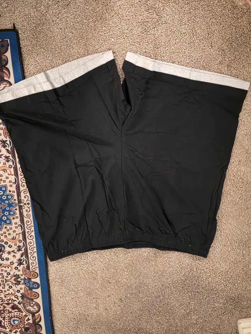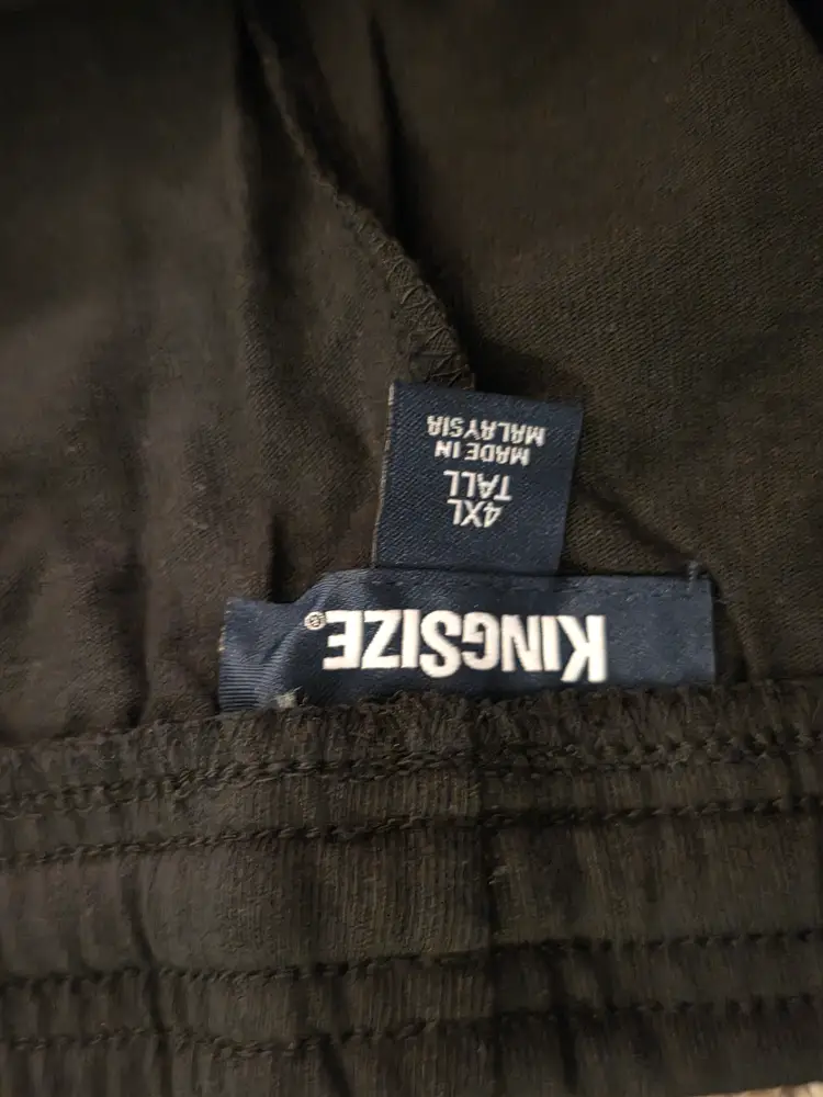 This product is a pair of Men's Big and Tall Basketball Shorts by Kingsize in size 4XLT. The shorts are black with a white stripe, making them stylish and versatile for athletic activities, like basketball. They feature a cuffed design, lightweight material for comfort during movement, and pockets for convenience. Made in Malaysia, these shorts are perfect for men looking for activewear that caters to their big and tall size.