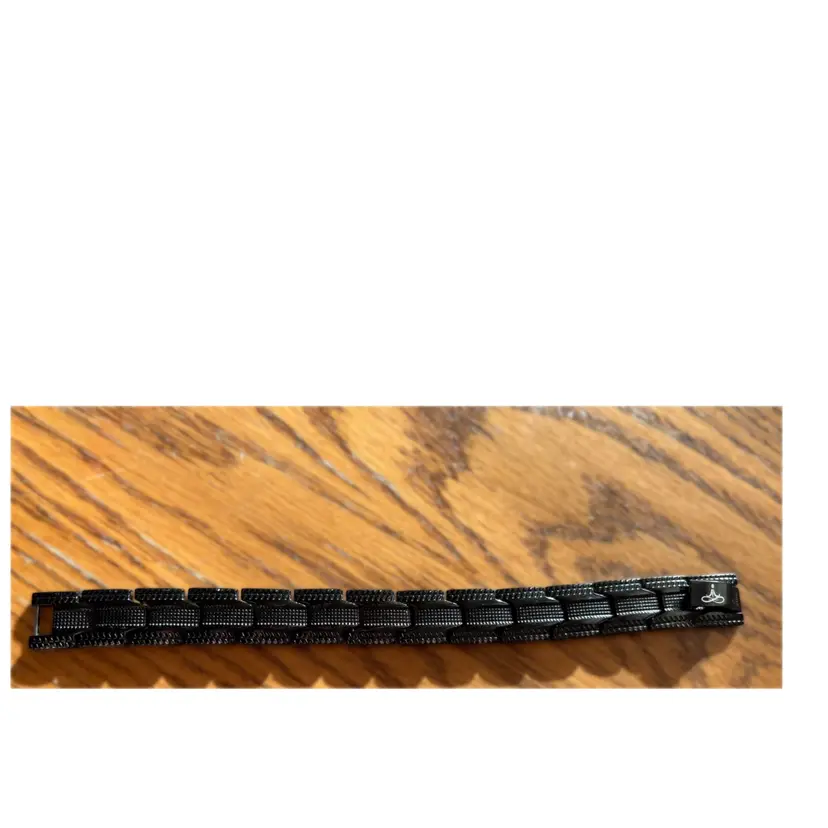 Sleek black link bracelet designed for everyday wear. Modern textured links offer a bold, masculine look. Lightweight stainless construction for comfortable all-day use. Pairs well with casual or dress outfits. Best for a 6.5” wrist.
