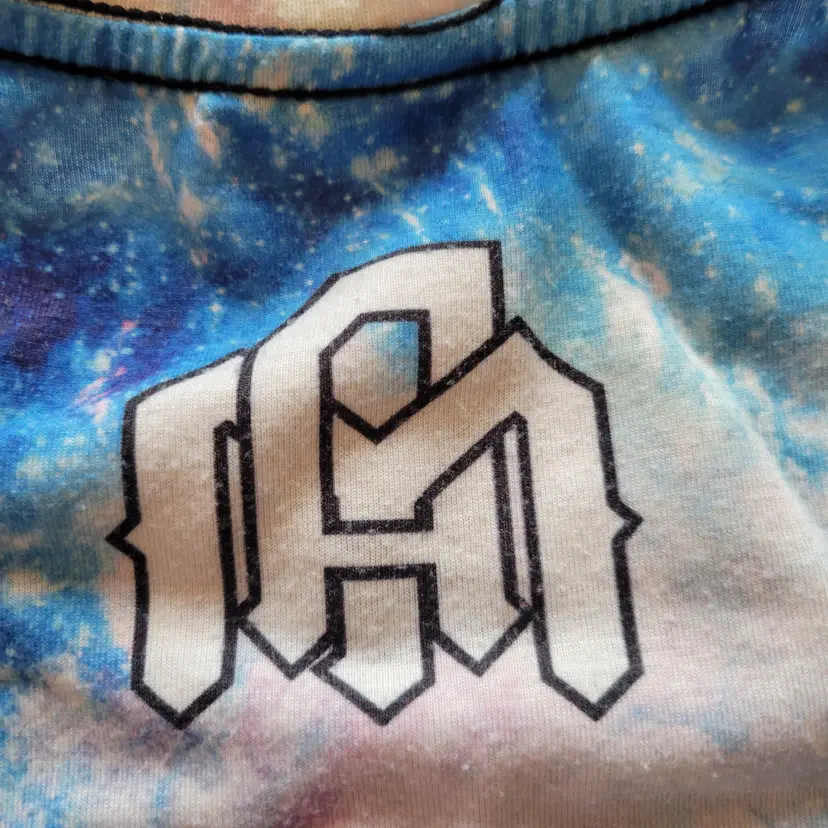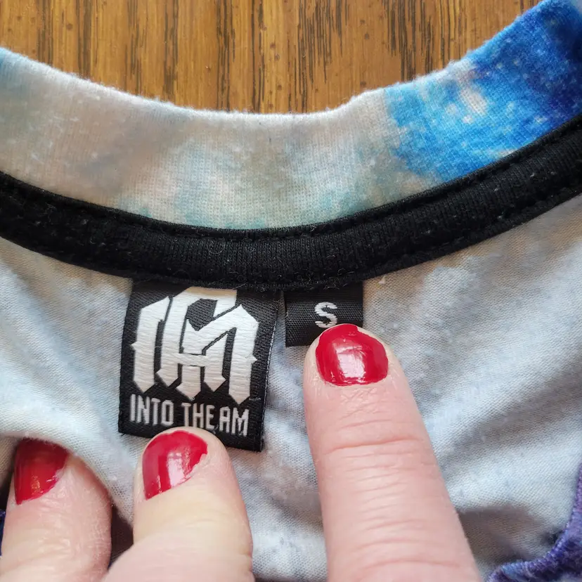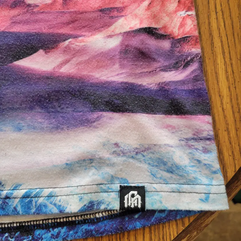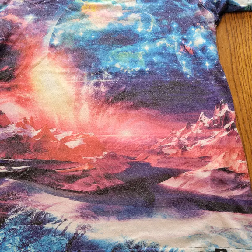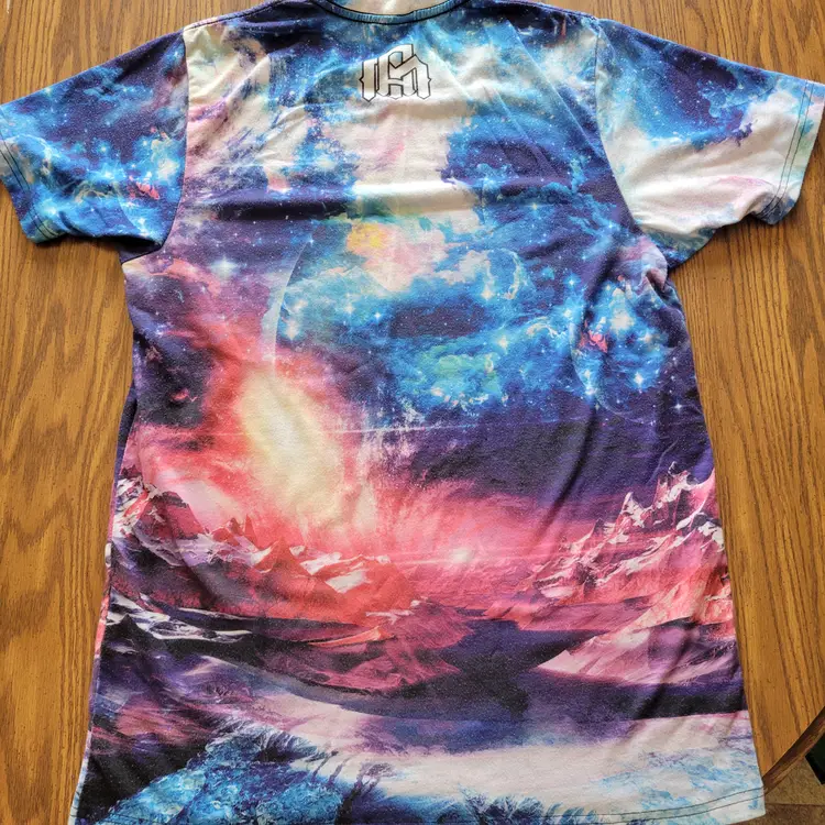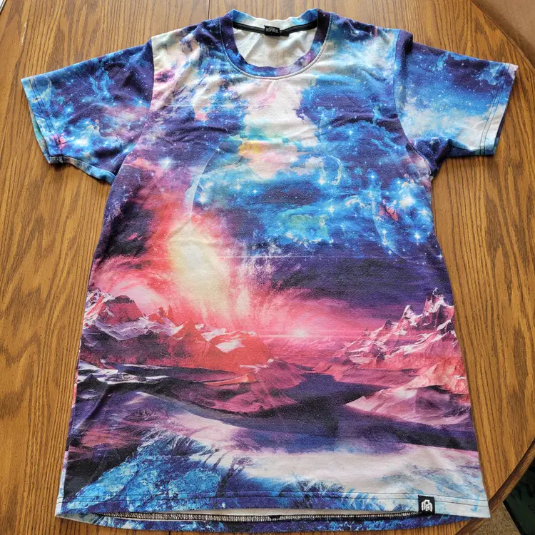Men's EDM Into The AM Festival Rave Tee Space & Mountains Print Size Small. Condition is Pre-owned - Good. Shipped with USPS Ground Advantage.