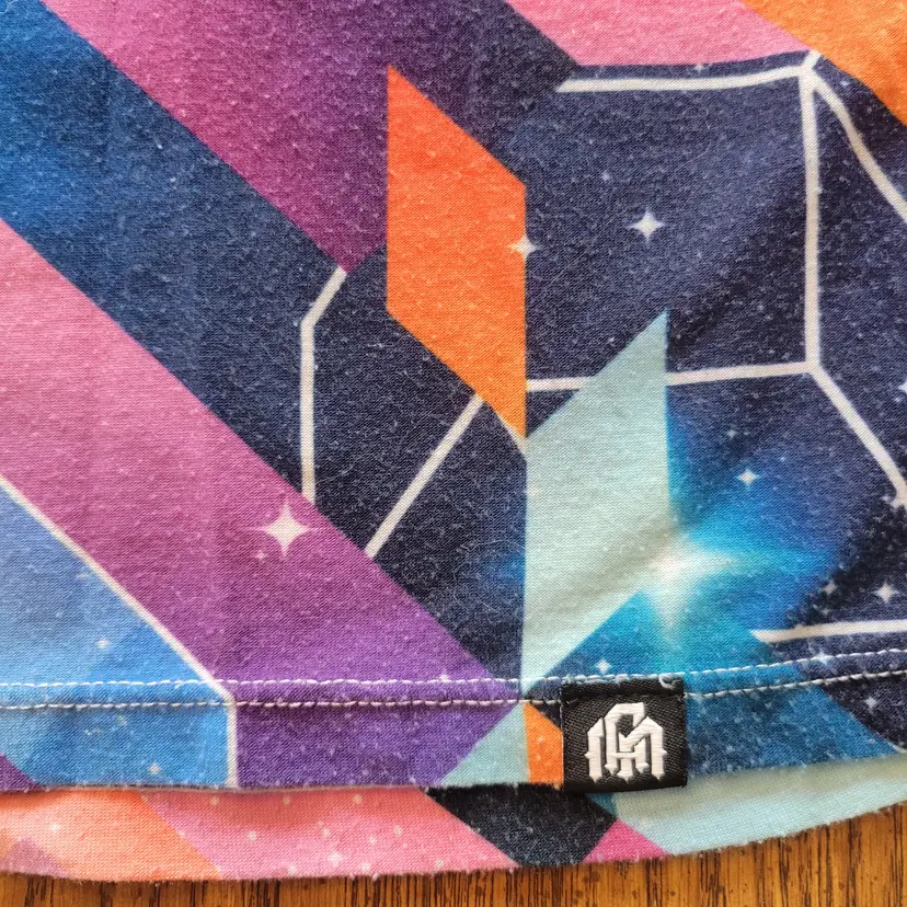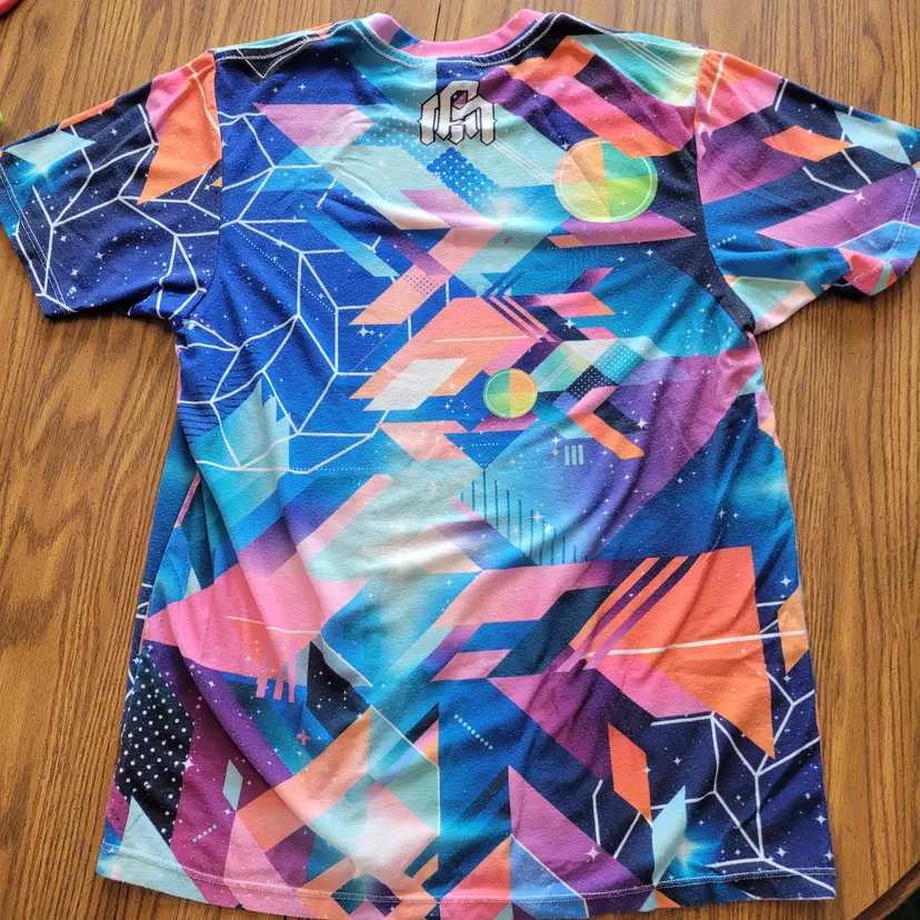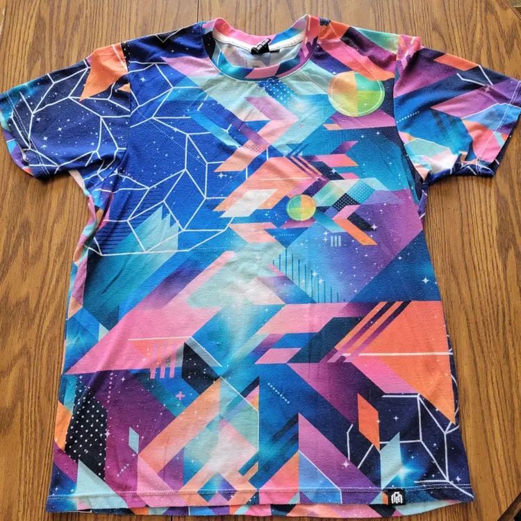 The Men's EDM Into The AM Festival Rave Tee features a unique geometric abstract print that embodies the theme of Electronic Dance Music. This multicolored shirt in size small is designed with a crew neck and short sleeve for a comfortable fit. Made from polyester, this T-shirt from the brand Into the AM is perfect for men looking to make a statement at their next music festival or rave event. Please see photos for condition.